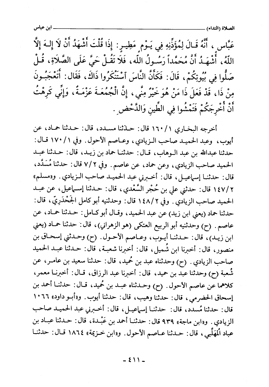 عَبَّاسٍ أَنَّهُ قَالَ لِمُؤَذِّنِهِ فِى يَوْمٍ مَطِيرٍ إِذَا قُلْتَ أَشْهَدُ أَنْ لَا إِلَهَ إِلَاّ اللَّهُ أَشْهَدُ أَنَّ مُحَمَّدًا رَسُولُ اللَّهِ فَلَا تَقُلْ حَىَّ عَلَى الصَّلَاةِ قُلْ صَلُّوا فِى بُيُوتِكُمْ - قَالَ - فَكَأَنَّ النَّاسَ اسْتَنْكَرُوا ذَاكَ فَقَالَ أَتَعْجَبُونَ مِنْ ذَا قَدْ فَعَلَ ذَا مَنْ هُوَ خَيْرٌ مِنِّى إِنَّ الْجُمُعَةَ عَزْمَةٌ وَإِنِّى كَرِهْتُ أَنْ أُحْرِجَكُمْ فَتَمْشُوا فِى الطِّينِ وَالدَّحْضِ.