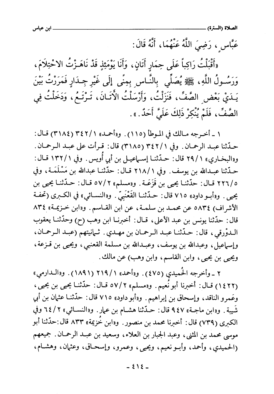 أَقْبَلْتُ رَاكِبًا عَلَى أَتَانٍ وأنايَوْمَئِذٍ قَدْ نَاهَزْتُ الاِحْتِلَامَ وَرَسُولُ اللَّهِ صلى الله عليه وسلم يُصَلِّى بِالنَّاسِ بِمِنًى فَمَرَرْتُ بَيْنَ يَدَىِ الصَّفِّ فَنَزَلْتُ فَأَرْسَلْتُ الأَتَانَ تَرْتَعُ وَدَخَلْتُ فِى الصَّفِّ فَلَمْ يُنْكِرْ ذَلِكَ عَلَىَّ أَحَدٌ.
