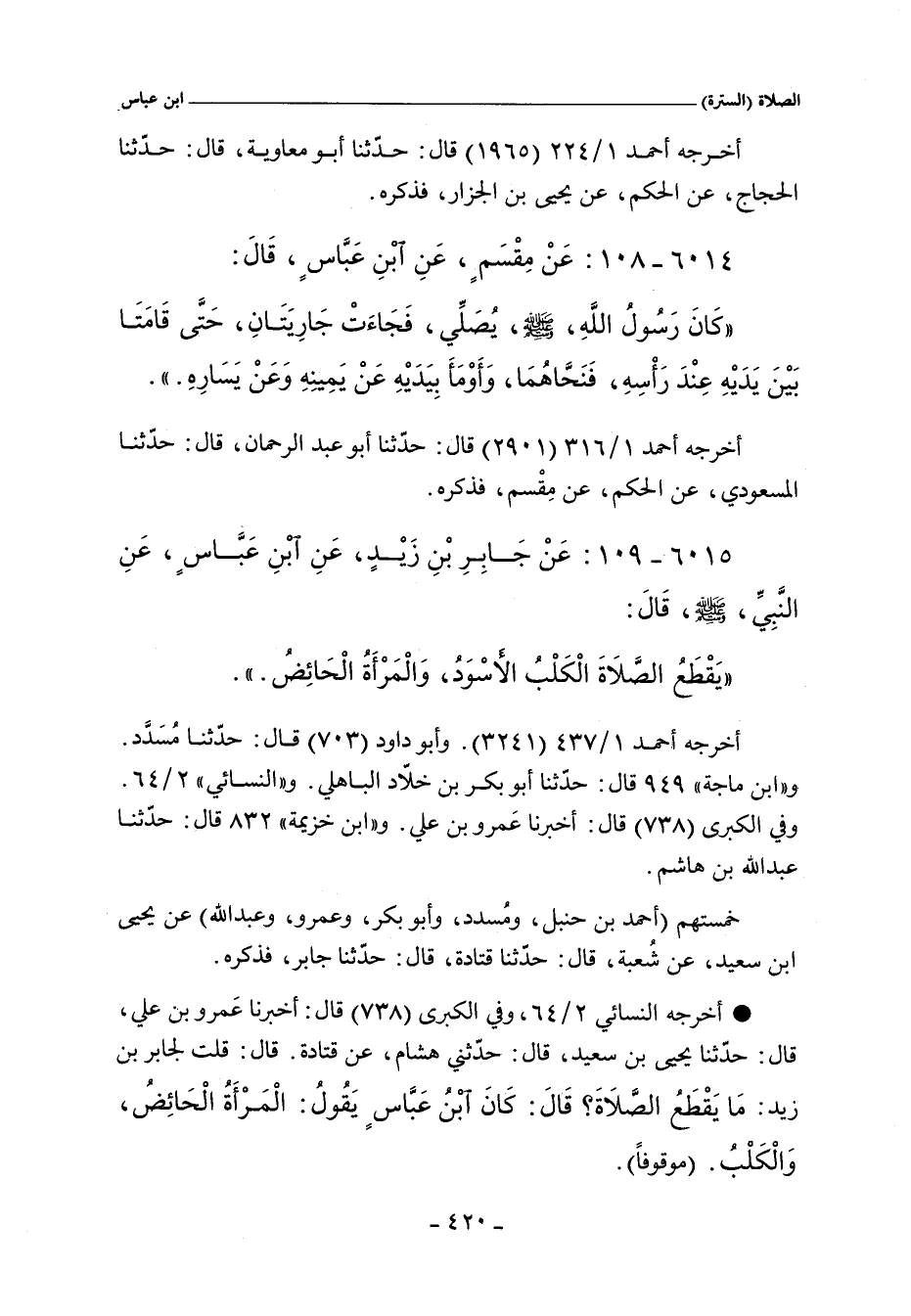 - أخرجه النسائي ٢/ ٦٤، وفي الكبرى ٨٢٩ قال: أَخْبَرَنَا عَمْرُو بْنُ عَلِىٍّ قَالَ حَدَّثَنَا يَحْيَى بْنُ سَعِيدٍ قَالَ حَدَّثَنِى شُعْبَةُ وَهِشَامٌ عَنْ قَتَادَةَ قَالَ قُلْتُ لِجَابِرِ بْنِ زَيْدٍ مَا يَقْطَعُ الصَّلَاةَ قَالَ كَانَ ابْنُ عَبَّاسٍ يَقُولُ الْمَرْأَةُ الْحَائِضُ وَالْكَلْبُ.