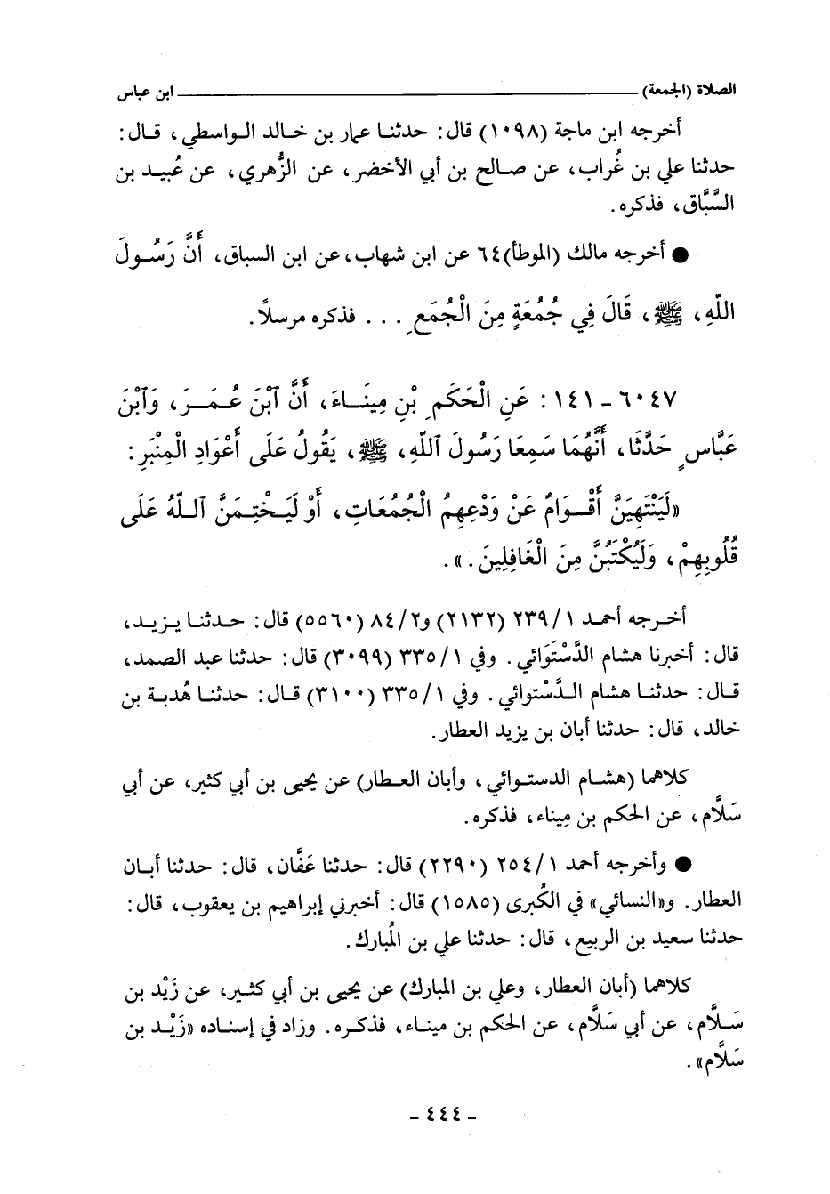 أَنَّ رَسُولَ اللَّهِ صلى الله عليه وسلم قَالَ وَهُوَ عَلَى أَعْوَادِ مِنْبَرِهِ لَيَنْتَهِيَنَّ أَقْوَامٌ عَنْ وَدْعِهِمُ الْجُمُعَاتِ أَوْ لَيَخْتِمَنَّ اللَّهُ عَلَى قُلُوبِهِمْ وَلَيَكُونَنَّ مِنَ الْغَافِلِينَ.