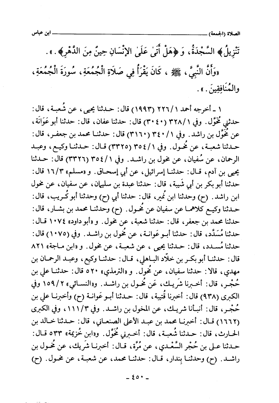 أخرجه أحمد ١/ ٢٢٦ (١٩٩٣) قال: حدثنا يحيى، عن شُعبة، حدثني مُخَوَّل , عن مسلم البطين. وفي ٢٧٢ (٢٤٥٧) قال: حدثنا حسين , حدثناا شريك , عن أبي إسحاق. وفي ١/ ٣٠٧ (٢٨٠٠) و ١/ ٣١٦ (٢٩٠٨) قال: حدثنا اسود بن عامر , حدثنا شريك , عن أبي إسحاق. وفي ١/ ٣٢٨ (٣٠٤٠) قال: حدثنا عفان، حدثنا أبو عَوَانَة، عن مُخَوَّل بن راشد , عن مسلم البطين. وفي ١/ ٣٣٤ (٣٠٩٦) قال: حدثنا عبد الصمد , وعفان. قالا: حدثنا همام , عن قتادة , عن عزرة. وفي (٣٠٩٧) قال: حدثنا اسود بن عامر , أخبرنا بكير بن أبي السميط. قال قتادة وفي ١/ ٣٤٠ (٣١٦٠) قال: حدثنا محمد بن جعفر، حدثنا شعبة عن مُخول قال: سمعت مسلمًا البطين يحدث. وفي ١/ ٣٥٤ (٣٣٢٥) قال: حدثنا وكيع، وعبد الرحمن، عن سُفيان، عن مخول بن راشد , عن مسلم البطين. وفي (٣٣٢٦) قال: حدثنا يحيى بن آدم، حدثنا إسرائيل، عن أبي إسحاق , عن مسلم البطين. وفي ١/ ٣٦١ (٣٤٠٤) قال: حدثنا بهز , حدثنا همام , عن قتادة , عن عزرة (ح) وعبد الصمد. قال: حدثنا همام , حدثنا قتادة , عن صاحب له. و"مسلم" ٣/ ١٦ (١٩٨٦) قال: حدثنا ابوبكر بن أبي شَيبة، حدثنا عبدة بن سليمان، عن سفيان، عن مخول ابن راشد , عن مسلم البطين. وفي (١٩٨٧) قال: وحدثنا ابن نُمير، حدثنا أبي (ح) وحدثنا أبو كُريب، حدثنا وكيع كلاهما عن سفيان بهذا الإسناد. وفي (١٩٨٨) قال: وحدثنا محمد بن بشار، حدثنا محمد بن جعفر، حدثنا شعبة، عن مخول بهذا الإسناد. و"أبو داود" ١٠٧٤ قال: حدثنا مُسَدَّد،