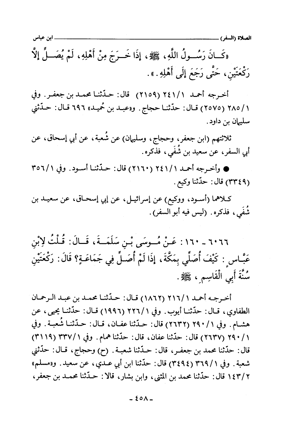كَانَ رَسُولُ اللَّهِ صلى الله عليه وسلم إِذَا خَرَجَ مِنْ أَهْلِهِ لَمْ يُصَلِّ إِلَاّ رَكْعَتَيْنِ حَتَّى يَرْجِعَ إِلَى أَهْلِهِ.