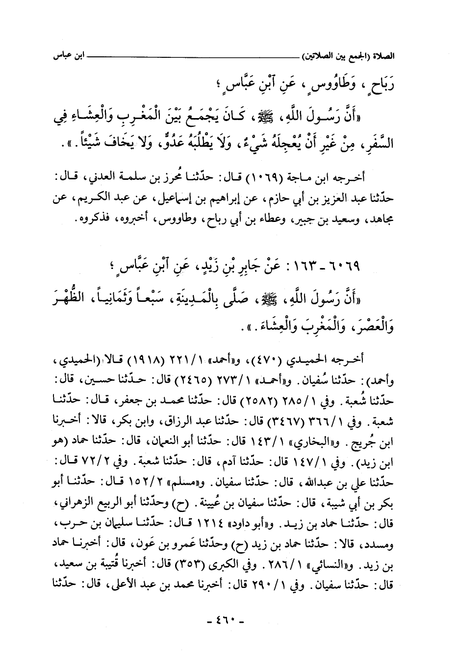 أَنَّ رَسُولَ اللَّهِ صلى الله عليه وسلم كَانَ يَجْمَعُ بَيْنَ الْمَغْرِبِ وَالْعِشَاءِ فِى السَّفَرِ مِنْ غَيْرِ أَنْ يُعْجِلَهُ شَىْءٌ وَلَا يَطْلُبَهُ عَدُوٌّ وَلَا يَخَافَ شَيْئًا.
