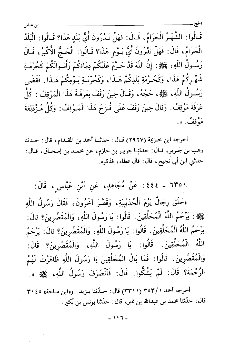 قالوا الشهر الحرام قال فهل تدرون أي بلد هذا قالوا البلد الحرام قال فهل تدرون أي يوم هذا قالوا الحج الأكبر قال رسول الله صلى الله عليه وسلم إن الله قد حرم عليكم دماءكم وأموالكم كحرمة شهركم هذا وكحرمة بلدكم هذا وكحرمة يومكم هذا فقضى رسول الله صلى الله عليه وسلم حجه وقال حين وقف بعرفة هذا الموقف كل عرفة موقف وقال حين وقف على قزح هذا الموقف وكل مزدلفة موقف.