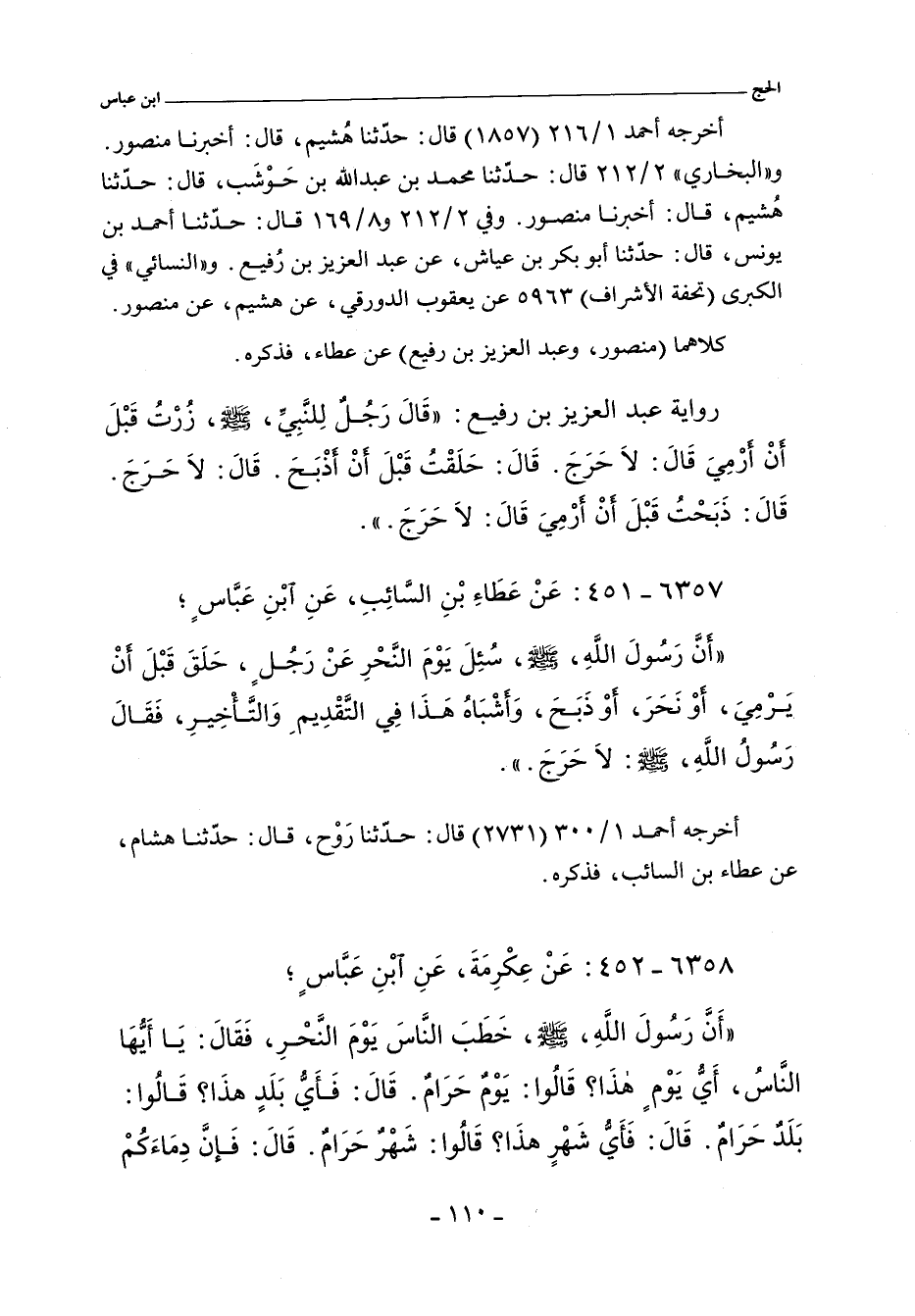 - لفظ عَبْدِ الْعَزِيزِ بْنِ رُفَيْعٍ: قَالَ رَجُلٌ لِلنَّبِىِّ صلى الله عليه وسلم زُرْتُ قَبْلَ أَنْ أَرْمِىَ. قَالَ لَا حَرَجَ قَالَ حَلَقْتُ قَبْلَ أَنْ أَذْبَحَ. قَالَ لَا حَرَجَ قَالَ ذَبَحْتُ قَبْلَ أَنْ أَرْمِىَ. قَالَ لَا حَرَجَ.
