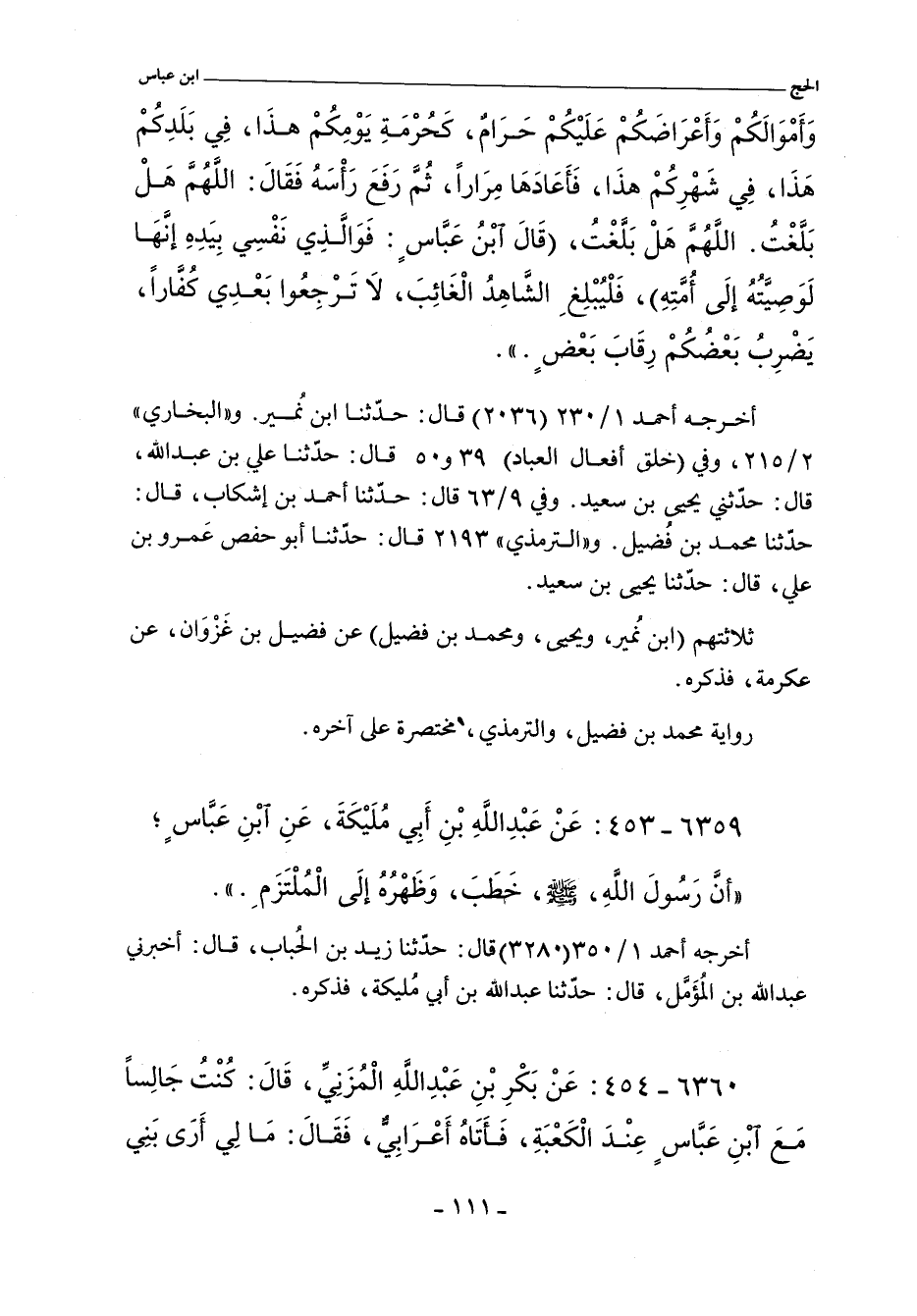 وَأَمْوَالَكُمْ وَأَعْرَاضَكُمْ عَلَيْكُمْ حَرَامٌ، كَحُرْمَةِ يَوْمِكُمْ هَذَا، فِى بَلَدِكُمْ هَذَا فِى شَهْرِكُمْ هَذَا فَأَعَادَهَا مِرَارًا، ثُمَّ رَفَعَ رَأْسَهُ فَقَالَ اللَّهُمَّ هَلْ بَلَّغْتُ اللَّهُمْ هَلْ بَلَّغْتُ قَالَ ابْنُ عَبَّاسٍ رضى الله عنهما فَوَالَّذِى نَفْسِى بِيَدِهِ إِنَّهَا لَوَصِيَّتُهُ إِلَى أُمَّتِهِ فَلْيُبْلِغِ الشَّاهِدُ الْغَائِبَ، لَا تَرْجِعُوا بَعْدِى كُفَّارًا يَضْرِبُ بَعْضُكُمْ رِقَابَ بَعْضٍ.