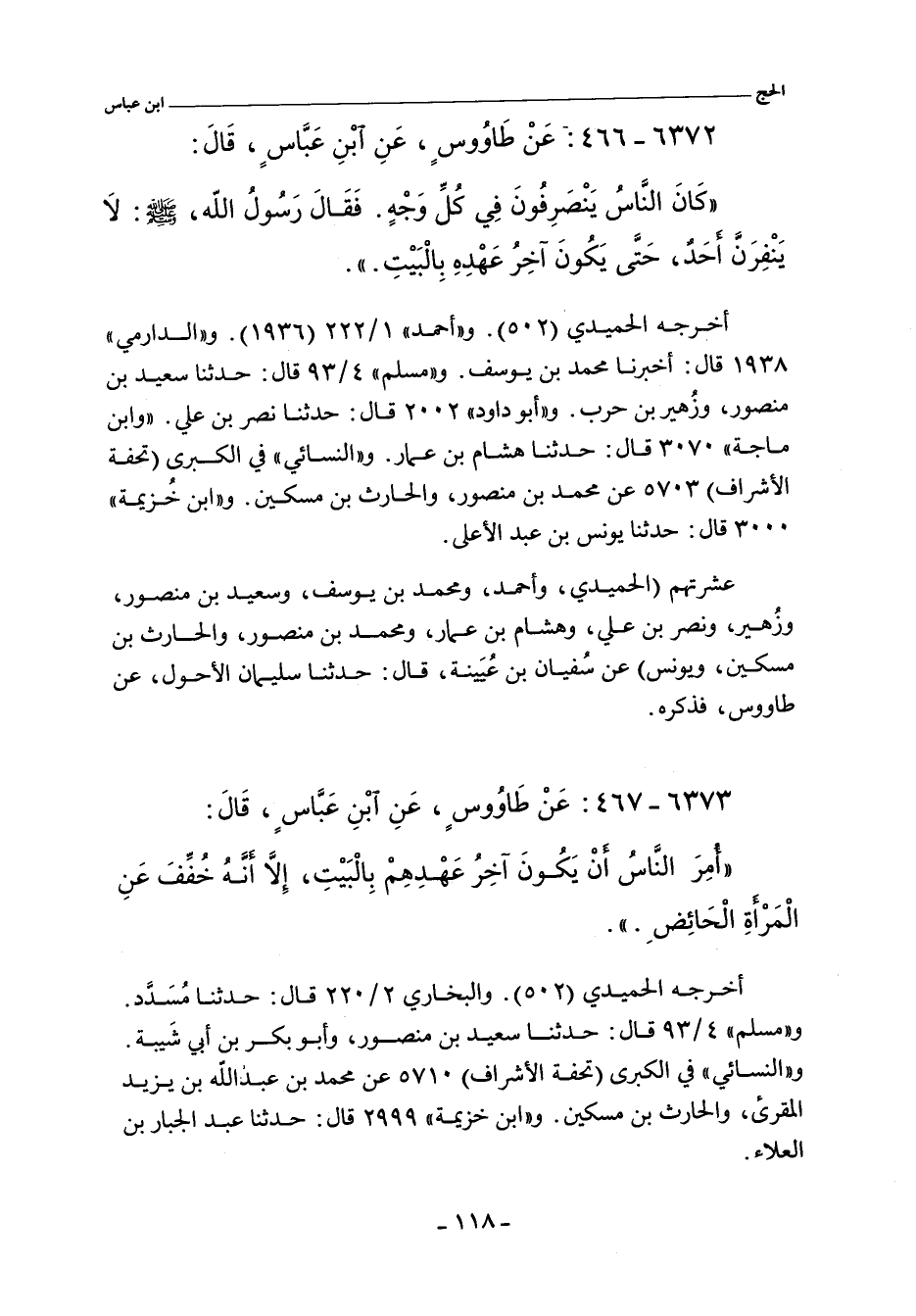 عشرتهم (الحميدي، وأحمد، ومحمد بن يوسف، وسعيد بن منصور، وزُهير، ونصر , وهشام بن عمار، ومحمد بن منصور، والحارث بن مسكين، ويونس) عن سُفيان بن عُيَينة. قال: حدثنا سليمان الأحول، عن طاووس، فذكره.