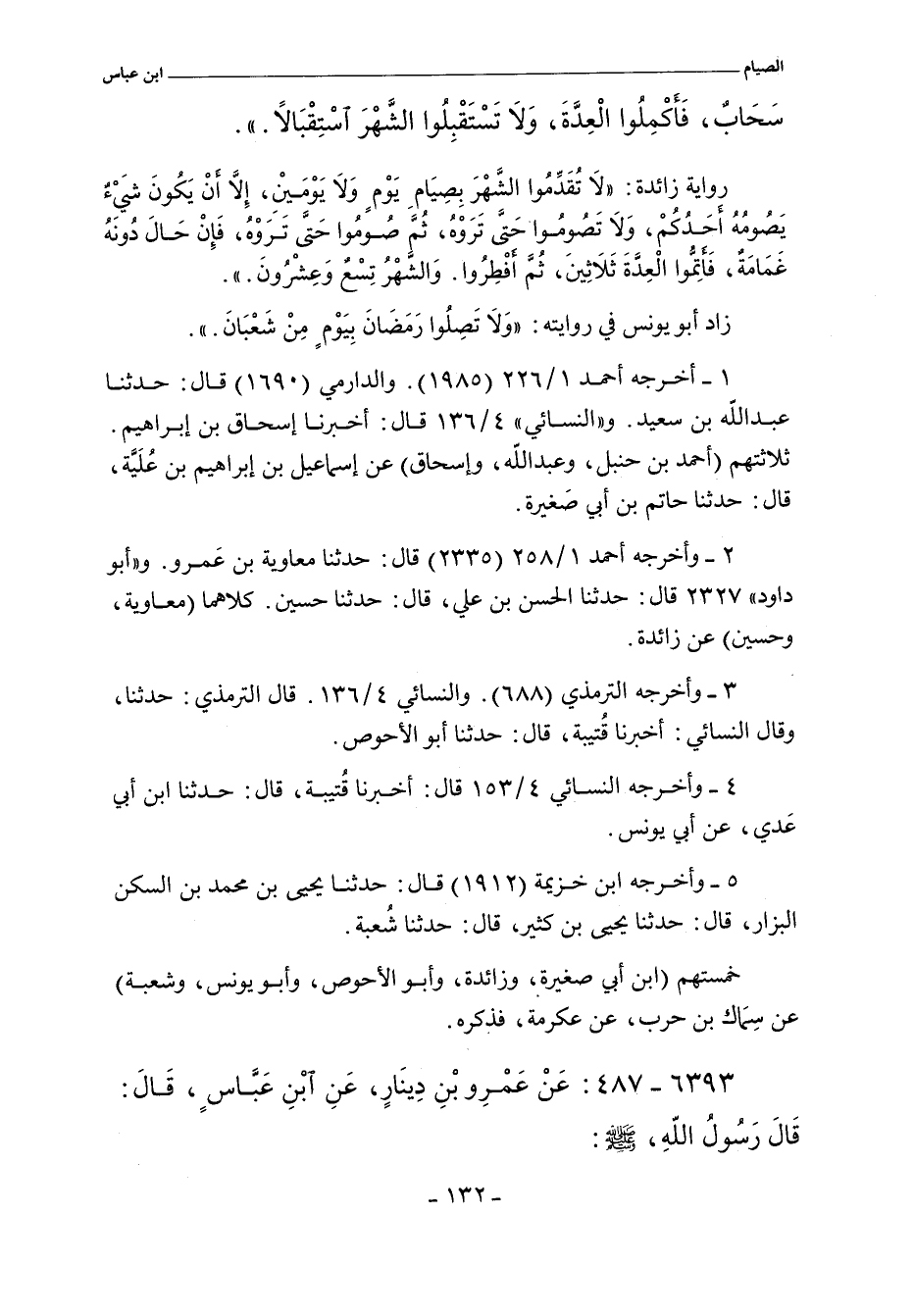 أخرجه أحمد ١/ ٢٢٦ (١٩٨٥٨) قال: حدثنا إسماعيل , أنبأنا حاتم بن أبي صغيرة. وفي ١/ ٢٥٨ (٢٣٣٥) قال: حدثنا معاوية بن عمرو , حدثنا زائدة. و"الدارمي" ١٦٨٣ قال: حدثنا عبد الله بن سعيد , حدثنا إسماعيل بن علية , حدثنا حاتم بن أبي صغيرة. و"أبو داود" ٢٣٢٧ قال: حدثنا الحسن بن علي , حدثنا حسين , عن زائدة. والتِّرْمِذِيّ" ٦٨٨ قال: حدثنا قتيبة , حدثنا أبو الأحوص. و"النَّسائي" ٤/ ١٣٦ , وفي "الكبرى" ٢٤٥٠ قال: أخبرنا إسحاق بن إبراهيم. قال: حدثنا إسماعيل بن إبراهيم. قال: حدثنا حاتم بن أبي صغيرة. وفي ٤/ ١٣٦ , وفي "الكبرى" ٢٤٥١ قال: أخبرنا قتيبة. قال: حدثنا أبو الأحوص. وفي ٤/ ١٥٣ , وفي "الكبرى" ٢٥١٠ قال: أخبرنا قتيبة. قال: حدثنا ابن أبي عدي , عن أبي يونس. و"ابن خزيمة" ١٩١٢ قال: حدثنا يحيى بن محمد بن السكن البزار , حدثنا يحيى بن كثير , حدثنا شعبة.