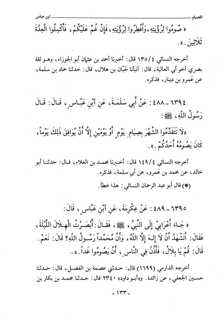 جَاءَ أَعْرَابِىٌّ إِلَى النَّبِىِّ صلى الله عليه وسلم فَقَالَ إِنِّى رَأَيْتُ الْهِلَالَ. قَالَ أَتَشْهَدُ أَنْ لَا إِلَهَ إِلَاّ اللَّهُ أَتَشْهَدُ أَنَّ مُحَمَّدًا رَسُولُ اللَّهِ قَالَ نَعَمْ. قَالَ يَا بِلَالُ أَذِّنْ فِى النَّاسِ أَنْ يَصُومُوا غَدًا.