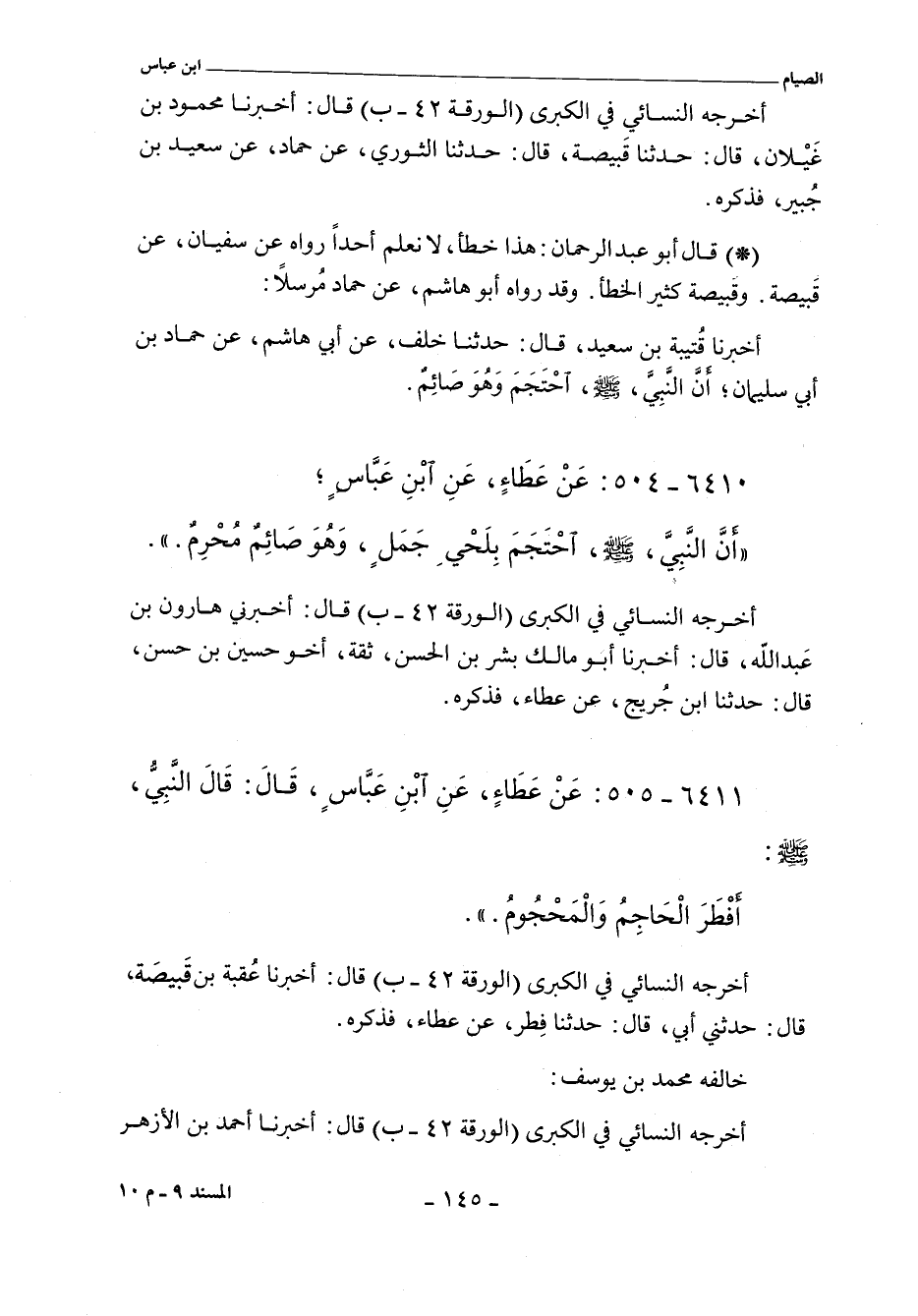 - قال أبو عبد الرحمن النسائي: هذا خطأ، لا نعلم أن أحدًا رواه عن سفيان، عن قَبيصة , وقبيصة كثير الخطأ , وقد رواه أبو هاشم، عن حماد , مُرسلاً.