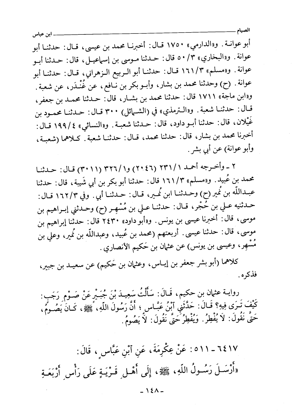 أبو عوانة. و"الدارمي" ١٧٤٣ قال: أخبرنا محمد بن عيسى، حدثنا أبو عوانة. و"البُخَارِي" ٣/ ٥٠ (١٩٧١) قال: حدثنا موسى بن إسماعيل، حدننا أبو عوانة. و"مسلم" ٣/ ١٦١ (٢٦٩٤) قال: حدثنا أبو الربيع الزهراني، حدثنا أبو عوانة. وفي (٢٦٩٥) قال: وحدثنا محمد بن بشار، وأبو بكر بن نافع، عن عندَر، عن شعبة. و "ابن ماجة" ١٧١١ قال: حدثنا محمد بن بشار، حدثنا محمد بن جعفر، قال: حدثنا شعبة. و"التِّرمِذي" في (الشمائل) ٣٠٠ قال: حدثنا محمود بن غَيْلان، حدثنا أبو داود، حدثنا شعبة. و"النَّسائي" ٤/ ١٩٩ , وفي "الكبرى" ٢٦٦٧ قال: أخبرنا محمد بن بشار. قال: حدثنا محمد. قال: حدثنا شعبة.