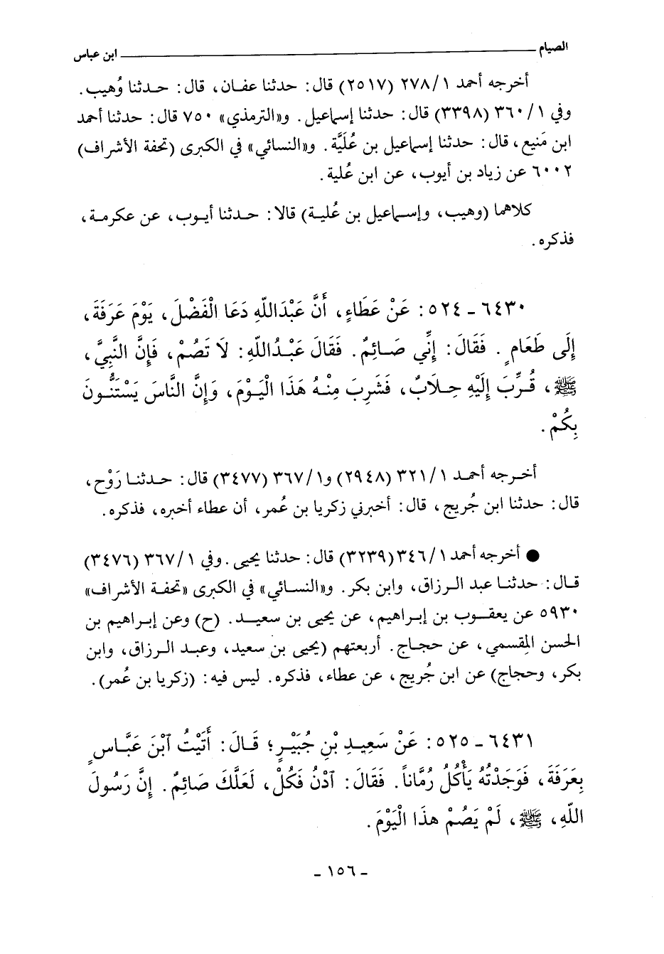 - وفي رواية: دَعَا عَبْدُ اللَّهِ بْنُ عَبَّاسٍ الْفَضْلَ بْنَ عَبَّاسٍ يَوْمَ عَرَفَةَ إِلَى طَعَامٍ فَقَالَ إِنِّى صَائِمٌ. فَقَالَ عَبْدُ اللَّهِ لَا تَصُمْ فَإِنَّ النَّبِىَّ صلى الله عليه وسلم قُرِّبَ إِلَيْهِ حِلَابٌ فِيهِ لَبَنٌ يَوْمَ عَرَفَةَ فَشَرِبَ مِنْهُ فَلَا تَصُمْ فَإِنَّ النَّاسَ مُسْتَنُّونَ بِكُمْ.