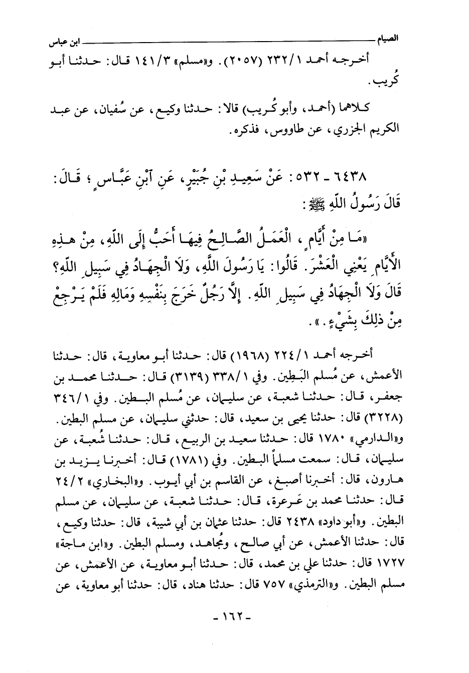 - وفي رواية: مَا مِنْ عَمَلٍ أَزْكَى عِنْدَ اللَّهِ عَزَّ وَجَلَّ وَلَا أَعْظَمَ أَجْرًا مِنْ خَيْرٍ تَعْمَلُهُ فِى عَشْرِ الأَضْحَى قِيلَ وَلَا الْجِهَادُ فِى سَبِيلِ اللَّهِ. قَالَ وَلَا الْجِهَادُ فِى سَبِيلِ اللَّهِ إِلَاّ رَجُلٌ خَرَجَ بِنَفْسِهِ وَمَالِهِ فَلَمْ يَرْجِعْ مِنْ ذَلِكَ بِشَىْءٍ.