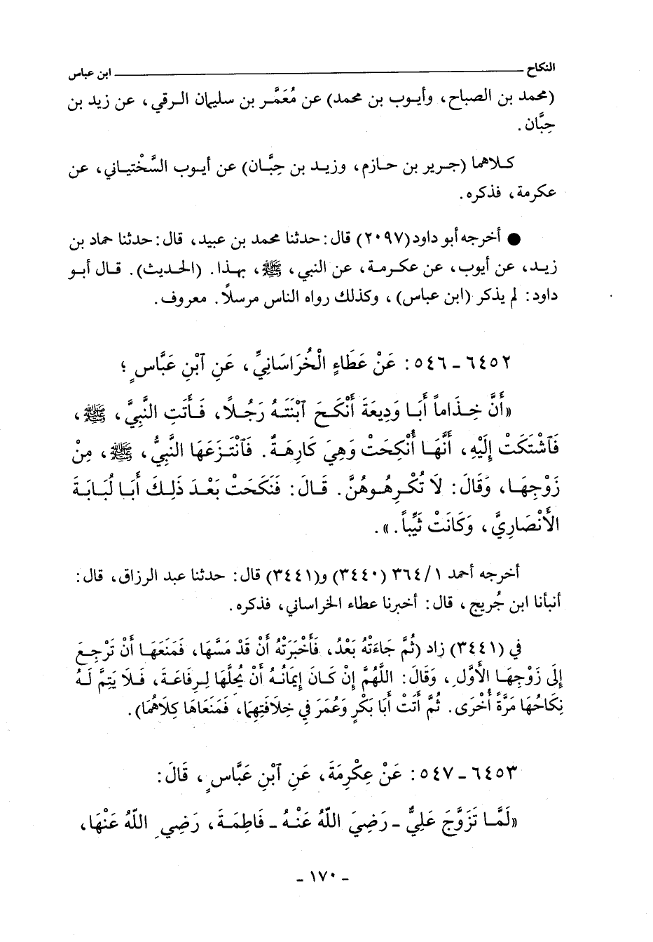 - أخرجه أحمد ١/ ٣٦٤ (٣٤٤١) قَالَ: حَدَّثَنَا عَبْدُ الرَّزَّاقِ أَنْبَأَنَا ابْنُ جُرَيْجٍ قَالَ حَدَّثَنِى عَطَاءٌ الْخُرَاسَانِىُّ عَنِ ابْنِ عَبَّاسٍ نَحْوَهُ وَزَادَ ثُمَّ جَاءَتْهُ بَعْدُ فَأَخْبَرَتْهُ أَنْ قَدْ مَسَّهَا فَمَنَعَهَا أنْ تَرْجِعَ إِلَى زَوْجِهَا الأَوَّلِ وَقَالَ اللَّهُمَّ إِنْ كَانَ إِيمَانُهُ أَنْ يُحِلَّهَا لِرِفَاعَةَ فَلَا يَتِمُّ لَهُ نِكَاحُهَا مَرَّةً أُخْرَى ثُمَّ أَتَتْ أَبَا بَكْرٍ وَعُمَرَ فِى خِلَافَتِهِمَا فَمَنَعَاهَا كِلَاهُمَا.