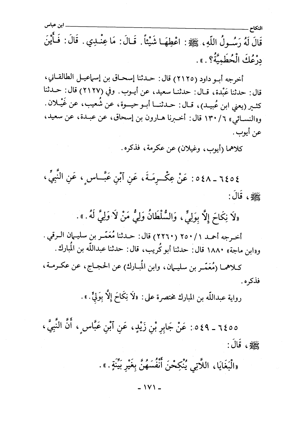 - رواية عَبْدُ اللَّهِ بْنُ الْمُبَارَكِ مختصرة على: لَا نِكَاحَ إِلَاّ بِوَلِىٍّ.