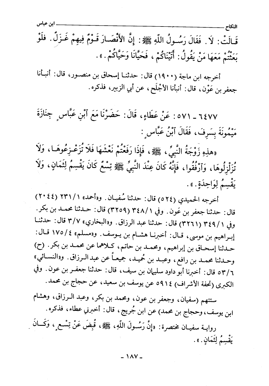أخرجه الحميدي (٥٢٤) قال: حدثنا سُفيان. و "أحمد" ١/ ٢٣١ (٢٠٤٤) قال: حدثنا جعفر بن عَون. وفي ١/ ٣٤٨ (٣٢٥٩) قال: حدثنا محمد بن بكر. وفي ١/ ٣٤٩ (٣٢٦١) قال: حدثنا عبد الرزاق. و"البُخاري" ٧/ ٣ (٥٠٦٧) قال: حدثنا إبراهيم بن موسى، أخبرنا هشام بن يوسف. و"مسلم" ٤/ ١٧٥ (٣٦٢٣) قال: حدثنا إسحاق بن إبراهيم، ومحمد بن حاتم. قال محمد بن حاتم: حدثنا محمد بن بكر. وفي (٣٦٢٤) قال: حدثنا محمد بن رافع، وعبد بن حُميد، جميعًا عن عبد الرزاق. و"النَّسائي" ٦/ ٥٣ , وفي "الكبرى" ٥٢٨٥ قال: أخبرنا أبو داود , سليمان بن سيف. قال: حدثنا جعفر بن عون. وفي "الكبرى" ٨٨٧٥ قال: أخبرنا يوسف بن سعيد، قال: حدثنا حجاج.