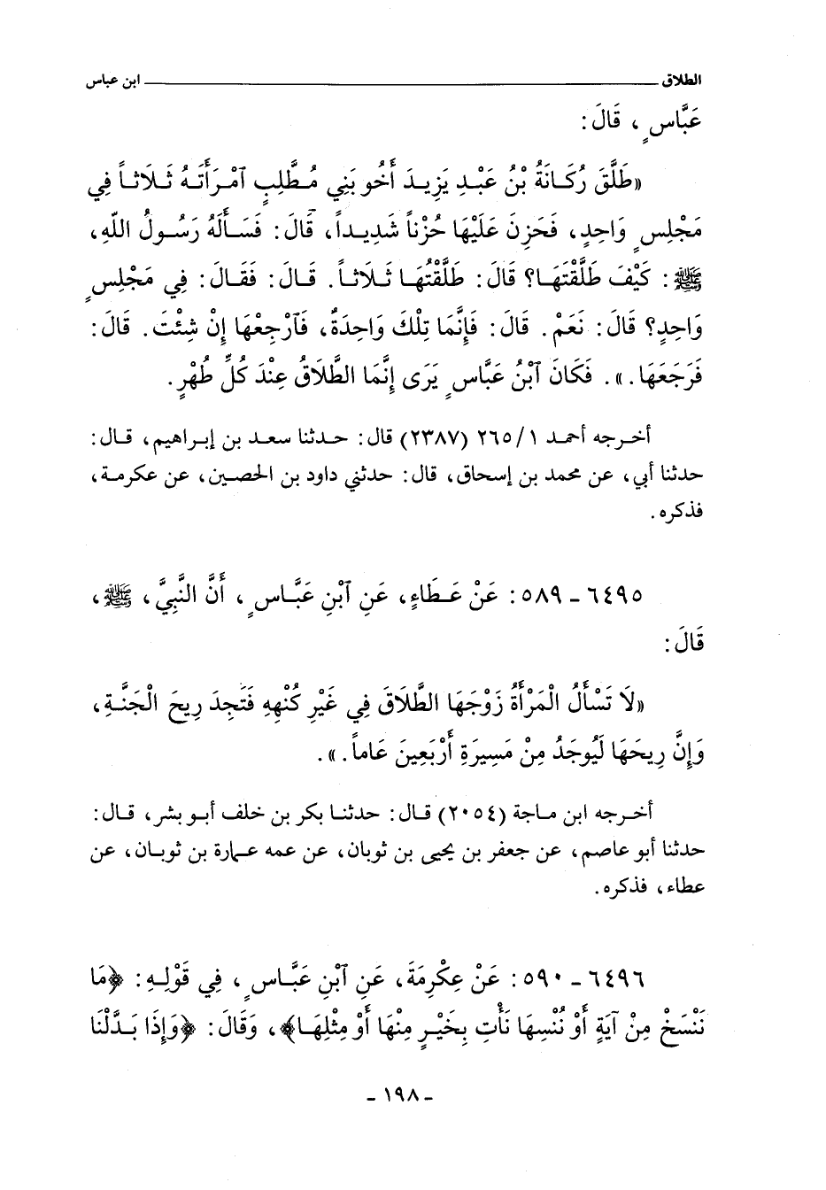 لَا تَسْأَلُ الْمَرْأَةُ زَوْجَهَا الطَّلَاقَ فِى غَيْرِ كُنْهِهِ فَتَجِدَ رِيحَ الْجَنَّةِ. وَإِنَّ رِيحَهَا لَيُوجَدُ مِنْ مَسِيرَةِ أَرْبَعِينَ عَامًا.
