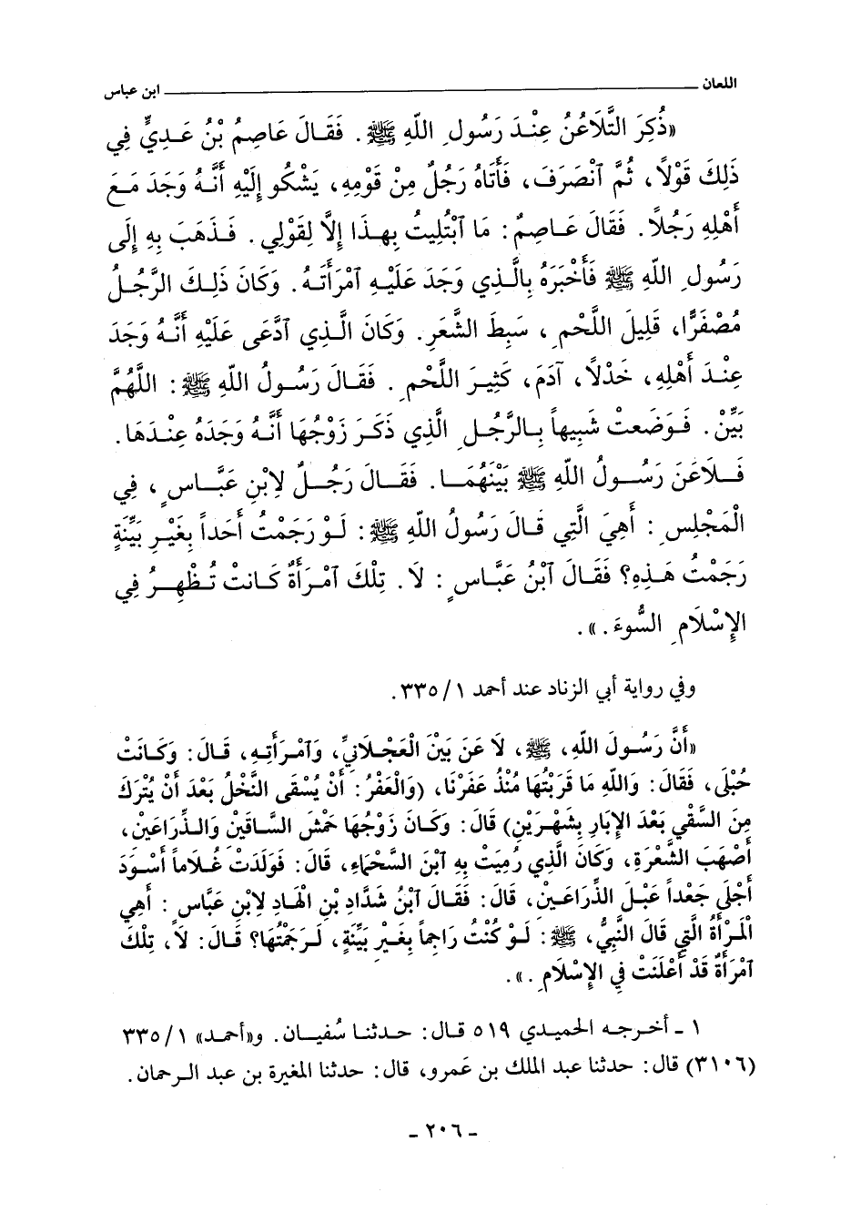 - وفي رواية: أَنَّ رَسُولَ اللَّهِ صلى الله عليه وسلم لَاعَنَ بَيْنَ الْعَجْلَانِىِّ وَامْرَأَتِهِ قَالَ وَكَانَتْ حُبْلَى فَقَالَ وَاللَّهِ مَا قَرَبْتُهَا مُنْذُ عَفَرْنَا وَالْعَفْرُ أَنْ يُسْقَى النَّخْلُ بَعْدَ أَنْ يُتْرَكَ مِنَ السَّقْىِ بَعْدَ الإِبَارِ بِشَهْرَيْنِ قَالَ وَكَانَ زَوْجُهَا حَمْشَ السَّاقَيْنِ وَالذِّرَاعَيْنِ أَصْهَبَ الشَّعَرَةِ وَكَانَ الَّذِى رُمِيَتْ بِهِ ابْنَ السَّحْمَاءِ قَالَ فَوَلَدَتْ غُلَامًا أَسْوَدَ أَجْلَى جَعْدًا عَبْلَ الذِّرَاعَيْنِ. قَالَ فَقَالَ ابْنُ شَدَّادِ بْنِ الْهَادِ لاِبْنِ عَبَّاسٍ أَهِىَ الْمَرْأَةُ الَّتِى قَالَ النَّبِىُّ صلى الله عليه وسلم لَوْ كُنْتُ رَاجِمًا بِغَيْرِ بَيِّنَةٍ لَرَجَمْتُهَا قَالَ لَا تِلْكَ امْرَأَةٌ قَدْ أَعْلَنَتْ فِى الإِسْلَامِ.
