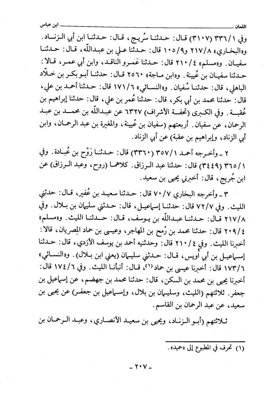 وفي ١/ ٣٣٦ (٣١٠٧) قال: حدثنا سُريج، حدثنا ابن أبي الزناد , فذكر معناه. وفي ١/ ٣٥٧ (٣٣٦٠) قال: حدثنا روح بن عبادة , حدثنا ابن جريج. قال: أخبرني يحيى بن سعيد. وفي ١/ ٣٦٥ (٣٤٤٩) قال: حدثنا عبد الرزاق. قال: أخبرنا ابن جريج. قال: حدثنا يحيى بن سعيد. و"البُخاري" ٧/ ٧٠ (٥٣١٠) قال: حدثنا سعيد بن حفير , قال: حدثنا الليث , عن يحيى بن سعيد , عن عبد الرحمن بن القاسم , وفي ٧/ ٧٢ (٥٣١٦) قال: حدثنا إسماعيل. قال: حدثني سليمان بن بلال , عن يحيى بن سعيد. قال: أخبرني عبد الرحمن بن القاسم. وفي ٨/ ٢١٧ (٦٨٥٥) و ٩/ ١٠٥ (٧٢٣٨) قال: حدثنا علي بن عبد الله، حدثنا سفيان , حدثنا أبو الزناد. وفي ٨/ ٢١٧ (٦٨٥٦) قال: حدثنا عبد الله بن يوسف , حدثنا الليث , حدثنا يحيى بن سعيد , عن عبد الرحمن بن القاسم. و"مسلم" ٤/ ٢٠٩ (٣٧٥١) قال: حدثنا محمد بن رمح بن المهاجر , وعيسى بن حماد , المصريان. قالا: أخبرنا الليث , عن يحيى بن سعيد , عن عبد الرحمن بن القاسم. وفي ٤/ ٢١٠ (٣٧٥٢) قال: وحدثنيه أحمد بن يوسف الأسدي , حدثنا إسماعيل بن أبي أويس , حدثني سليمان , يعني ابن بلال , عن يحيى , حدثني عبد الرحمن بن القاسم. وفي (٣٧٥٣) قال: وحدثنا عَمرو الناقد، وابن أبي عمر. قالا: حدثنا سفيان بن عُيينة , عن أبي الزناد. و "ابن ماجة" ٢٥٦٠ قال: حدثنا أبو بكر بن خلاد الباهلي، حدثنا سُفيان , عن أبي الزناد. و"النَّسَائي" ٦/ ١٧١ قال: حدثنا أحمد بن علي. قال: حدثنا محمد بن أبي بكر. قال: حدثنا عُمر بن علي. قال: حدثنا إبراهيم بن عُقبة , عن أبي الزناد. وفي ٦/ ١٧٣ , وفي "الكبرى" ٥٦٣٥ و ٧٢٩٥ قال: أخبرنا عيسى بن حماد. قال: أنبأنا الليث بن سعد , عن يحيى بن سعيد , عن عبد الرحمن بن القاسم.