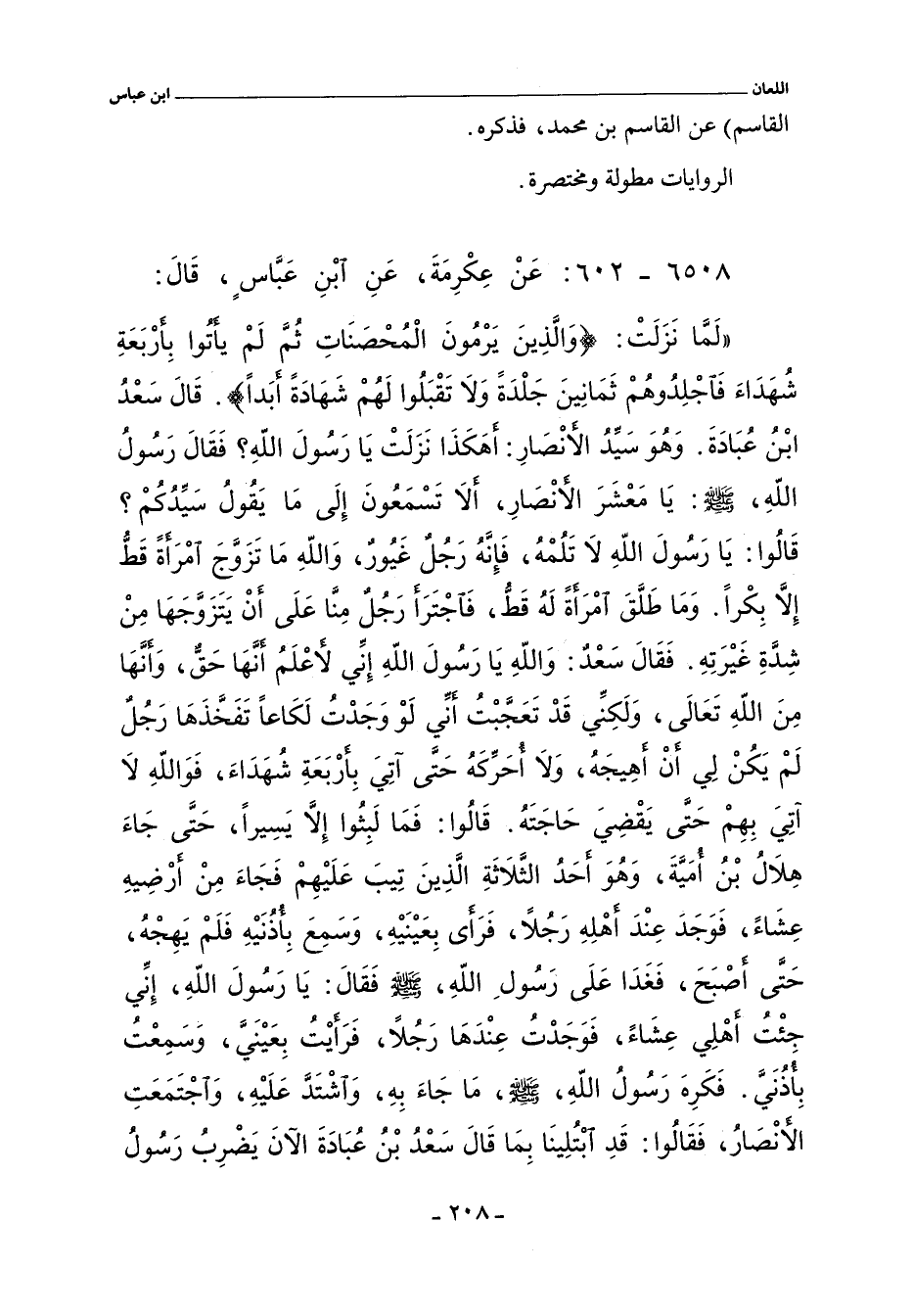 لَمَّا نَزَلَتْ (وَالَّذِينَ يَرْمُونَ الْمُحْصَنَاتِ ثُمَّ لَمْ يَأْتُوا بِأَرْبَعَةِ شُهَدَاءَ فَاجْلِدُوهُمْ ثَمَانِينَ جَلْدَةً وَلَا تَقْبَلُوا لَهُمْ شَهَادَةً أَبَدًا) قَالَ سَعْدُ بْنُ عُبَادَةَ وَهُوَ سَيِّدُ الأَنْصَارِ أَهَكَذَا نَزَلَتْ يَا رَسُولَ اللَّهِ فَقَالَ رَسُولُ اللَّهِ صلى الله عليه وسلم يَا مَعْشَرَ الأَنْصَارِ أَلَا تَسْمَعُونَ إِلَى مَا يَقُولُ سَيِّدُكُمْ قَالُوا يَا رَسُولَ اللَّهِ لَا تَلُمْهُ فَإِنَّهُ رَجُلٌ غَيُورٌ وَاللَّهِ مَا تَزَوَّجَ امْرَأَةً قَطُّ إِلَاّ بِكْرًا وَمَا طَلَّقَ امْرَأَةً لَهُ قَطُّ فَاجْتَرَأَ رَجُلٌ مِنَّا عَلَى أَنْ يَتَزَوَّجَهَا مِنْ شِدَّةِ غَيْرَتِهِ. فَقَالَ سَعْدٌ وَاللَّهِ يَا رَسُولَ اللَّهِ إِنِّى لأَعْلَمُ أَنَّهَا حَقٌّ وَأَنَّهَا مِنَ اللَّهِ تَعَالَى وَلَكِنِّى قَدْ تَعَجَّبْتُ أَنِّى لَوْ وَجَدْتُ لَكَاعًا تَفَخَّذَهَا رَجُلٌ لَمْ يَكُنْ لِى أَنْ أَهِيجَهُ وَلَا أُحَرِّكَهُ حَتَّى آتِىَ بِأَرْبَعَةِ شُهَدَاءَ فَوَاللَّهِ لَا آتِى بِهِمْ حَتَّى يَقْضِىَ حَاجَتَهُ. قَالَ فَمَا لَبِثُوا إِلَاّ يَسِيرًا حَتَّى جَاءَ هِلَالُ بْنُ أُمَيَّةَ وَهُوَ أَحَدُ الثَّلَاثَةِ الَّذِينَ تِيبَ عَلَيْهِمْ فَجَاءَ مِنْ أَرْضِهِ عِشَاءً فَوَجَدَ عِنْدَ أَهْلِهِ رَجُلاً فَرَأَى بِعَيْنَيْهِ وَسَمِعَ بِأُذُنَيْهِ فَلَمْ يُهِجْهُ حَتَّى أَصْبَحَ فَغَدَا عَلَى رَسُولِ اللَّهِ صلى الله عليه وسلم فَقَالَ يَا رَسُولَ اللَّهِ إِنِّى جِئْتُ أَهْلِى عِشَاءً فَوَجَدْتُ عِنْدَهَا رَجُلاً فَرَأَيْتُ بِعَيْنَىَّ وَسَمِعْتُ بِأُذُنَىَّ. فَكَرِهَ رَسُولُ اللَّهِ صلى الله عليه وسلم مَا جَاءَ بِهِ وَاشْتَدَّ عَلَيْهِ وَاجْتَمَعَتِ الأَنْصَارُ فَقَالُوا قَدِ ابْتُلِينَا بِمَا قَالَ سَعْدُ بْنُ