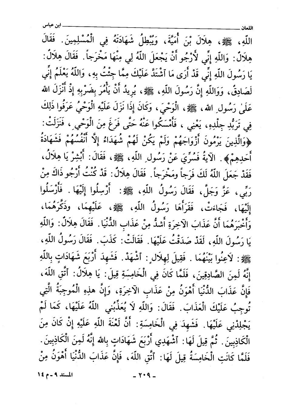 اللَّهِ صلى الله عليه وسلم هِلَالَ بْنَ أُمَيَّةَ وَيُبْطِلُ شَهَادَتَهُ فِى الْمُسْلِمِينَ. فَقَالَ هِلَالٌ وَاللَّهِ إِنِّى لأَرْجُو أَنْ يَجْعَلَ اللَّهُ لِى مِنْهَا مَخْرَجًا. فَقَالَ هِلَالٌ يَا رَسُولَ اللَّهِ إِنِّى قَدْ أَرَى مَا اشْتَدَّ عَلَيْكَ مِمَّا جِئْتُ بِهِ وَاللَّهُ يَعْلَمُ إِنِّى لَصَادِقٌ. وَوَاللَّهِ إِنَّ رَسُولَ اللَّهِ صلى الله عليه وسلم يُرِيدُ أَنْ يَأْمُرَ بِضَرْبِهِ إِذْ أَنْزَلَ اللَّهُ عَلَى رَسُولِ اللَّهِ صلى الله عليه وسلم الْوَحْىَ وَكَانَ إِذَا نَزَلَ عَلَيْهِ الْوَحْىُ عَرَفُوا ذَلِكَ فِى تَرَبُّدِ جِلْدِهِ يَعْنِى فَأَمْسَكُوا عَنْهُ حَتَّى فَرَغَ مِنَ الْوَحْىِ فَنَزَلَتْ وَالَّذِينَ يَرْمُونَ أَزْوَاجَهُمْ وَلَمْ يَكُنْ لَهُمْ شُهَدَاءُ إِلَاّ أَنْفُسُهُمْ فَشَهَادَةُ أَحَدِهِمْ الآيَةَ فَسُرِّىَ عَنْ رَسُولِ اللَّهِ صلى الله عليه وسلم فَقَالَ أَبْشِرْ يَا هِلَالُ فَقَدْ جَعَلَ اللَّهُ لَكَ فَرَجًا وَمَخْرَجًا فَقَالَ هِلَالٌ قَدْ كُنْتُ أَرْجُو ذَاكَ مِنْ رَبِّى عَزَّ وَجَلَّ. فَقَالَ رَسُولُ اللَّهِ صلى الله عليه وسلم أَرْسِلُوا إِلَيْهَا فَأَرْسَلُوا إِلَيْهَا فَجَاءَتْ فَتَلَاهَا رَسُولُ اللَّهِ صلى الله عليه وسلم عَلَيْهِمَا وَذَكَّرَهُمَا وَأَخْبَرَهُمَا أَنَّ عَذَابَ الآخِرَةِ أَشَدُّ مِنْ عَذَابِ الدُّنْيَا فَقَالَ هِلَالٌ وَاللَّهِ يَا رَسُولَ اللَّهِ لَقَدْ صَدَقْتُ عَلَيْهَا. فَقَالَتْ كَذَبَ. فَقَالَ رَسُولُ اللَّهِ صلى الله عليه وسلم لَاعِنُوا بَيْنَهُمَا فَقِيلَ لِهِلَالٍ اشْهَدْ. فَشَهِدَ أَرْبَعَ شَهَادَاتٍ بِاللَّهِ إِنَّهُ لَمِنَ الصَّادِقِينَ فَلَمَّا كَانَ فِى الْخَامِسَةِ قِيلَ يَا هِلَالُ اتَّقِ اللَّهَ فَإِنَّ عَذَابَ الدُّنْيَا أَهْوَنُ مِنْ