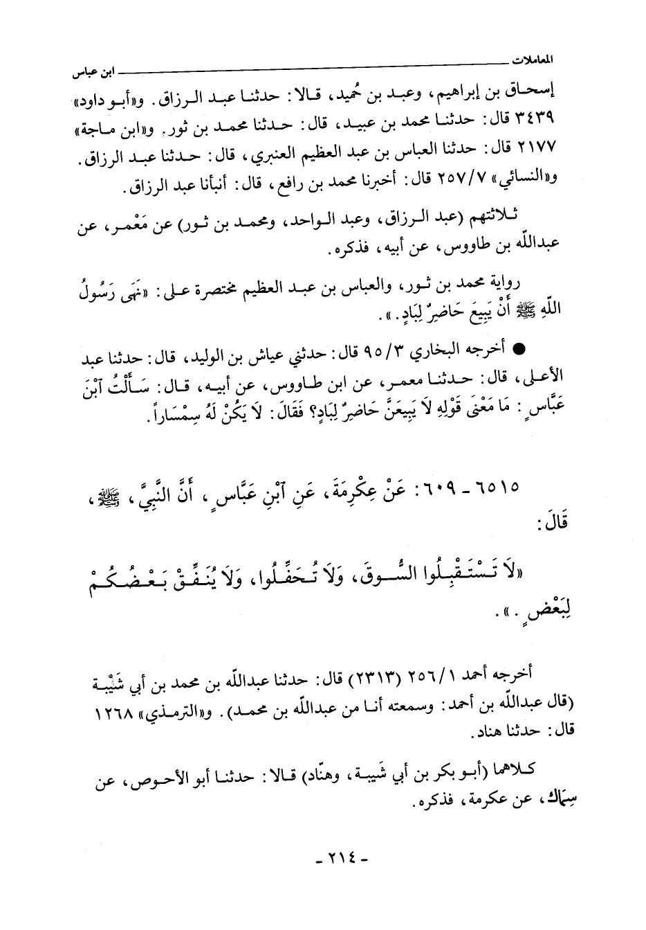 - أخرجه البخاري ٣/ ٩٥ (٢١٦٣) قال: حدثني عياش بن الوليد، حدثنا عبد الأعلى، حدثنا معمر، عن ابن طاووس، عن أبيه، قال: سَأَلْتُ ابْنَ عَبَّاسٍ: مَا مَعْنَى قَوْلِهِ لا يَبِيعَنَّ حَاضِرٌ لِبَادٍ؟ فَقَالَ: لَا يَكُنْ لَهُ سِمْسَارًا.