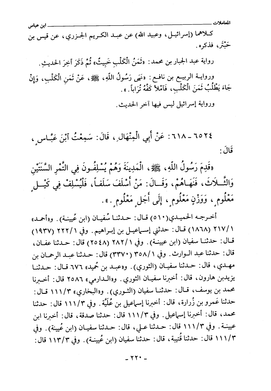 قَدِمَ رَسُولُ اللَّهِ صلى الله عليه وسلم الْمَدِينَةَ وَهُمْ يُسْلِفُونَ فِى التَّمْرِ السَّنَتَيْنِ وَالثَّلَاثَ فَنَهَاهُمْ وَقَالَ «مَنْ أَسْلَفَ سَلَفًا فَلْيُسْلِفْ فِى كَيْلٍ مَعْلُومٍ وَوَزْنٍ مَعْلُومٍ إِلَى أَجَلٍ مَعْلُومٍ.