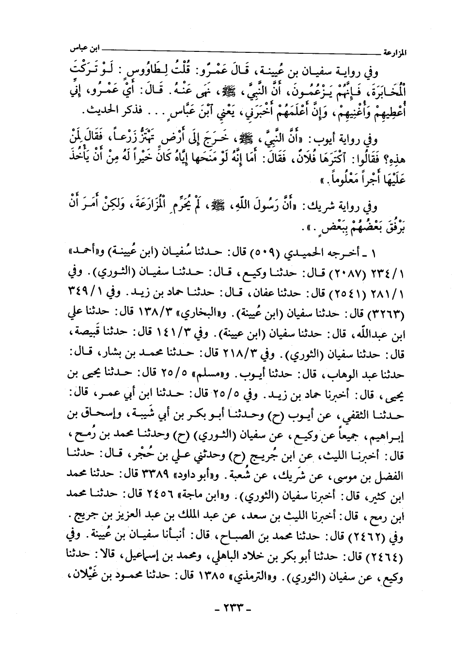 - وفي رواية: قَالَ عَمْرٌو قُلْتُ لِطَاوُسٍ لَوْ تَرَكْتَ الْمُخَابَرَةَ فَإِنَّهُمْ يَزْعُمُونَ أَنَّ النَّبِىَّ صلى الله عليه وسلم نَهَى عَنْهُ. قَالَ أَىْ عَمْرُو، إِنِّى أُعْطِيهِمْ وَأُغْنِيهِمْ، وَإِنَّ أَعْلَمَهُمْ أَخْبَرَنِى - يَعْنِى ابْنَ عَبَّاسٍ - رضى الله عنهما - أَنَّ النَّبِىَّ صلى الله عليه وسلم لَمْ يَنْهَ عَنْهُ، وَلَكِنْ قَالَ أَنْ يَمْنَحَ أَحَدُكُمْ أَخَاهُ خَيْرٌ لَهُ مِنْ أَنْ يَأْخُذَ عَلَيْهِ خَرْجًا مَعْلُومًا.