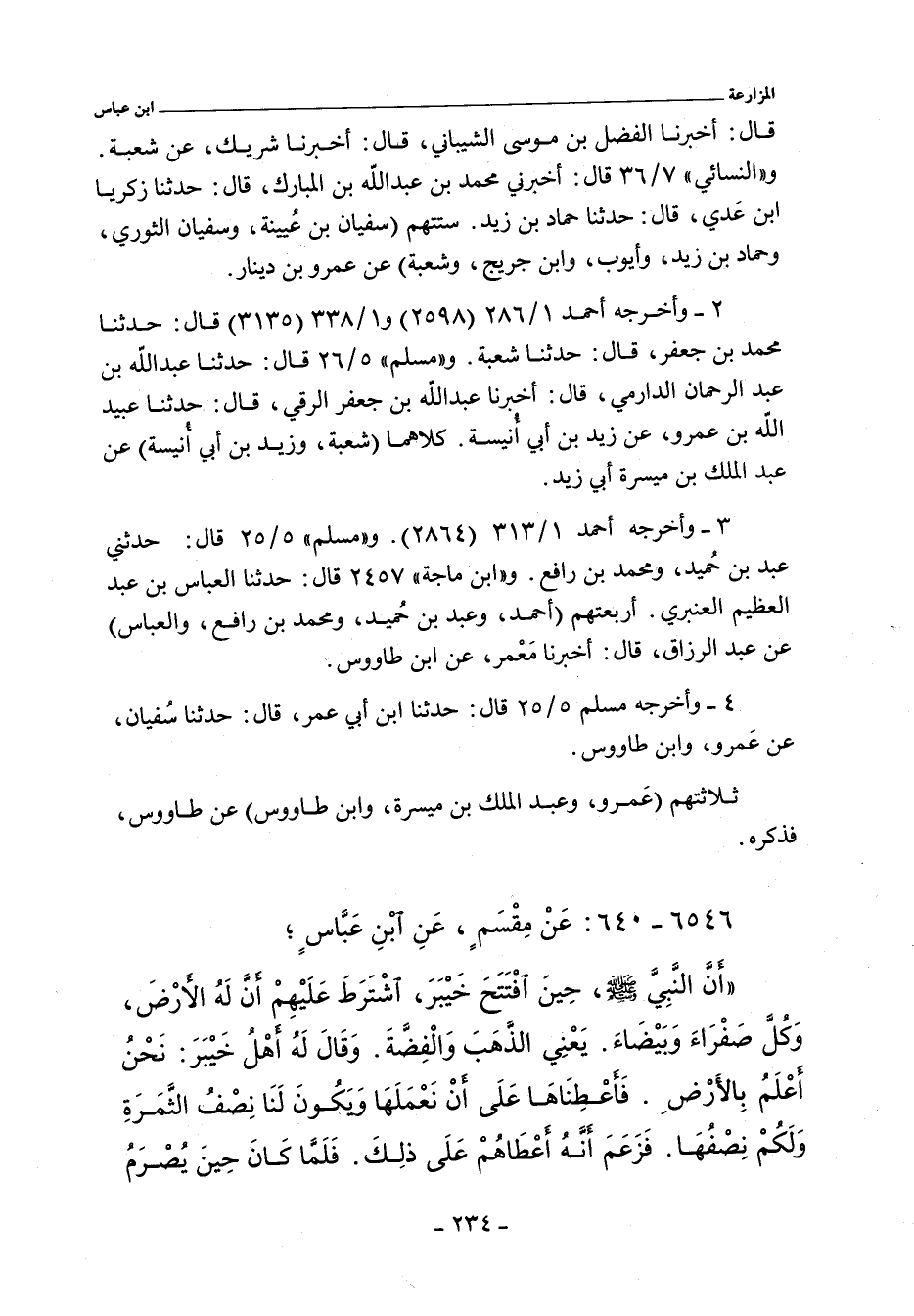 - ومن رواية عمرو بن دينار , عن ابن عمر , قال: كنا نخابر , ولا نرى بذلك بأسا , حتى زعم رافع بن خديج أن رسول الله صلى الله عليه وسلم نهى عنه. قال عمرو: فذكرته لطاووس. فقال طاووس: قال ابن عباس: إنما قال رسول الله صلى الله عليه وسلم: يمنح أحدكم أخاه الأرض , خير له من أن يأخذ لها خراجا معلوما. وسلف برقم (٤٢٨٨.