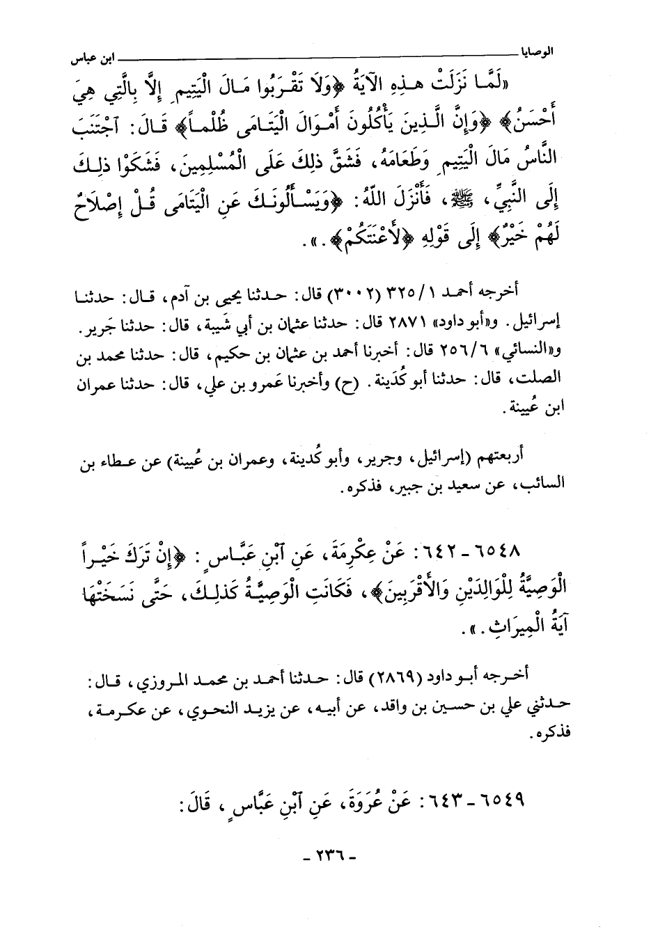 ٦٥٤٨ - عَنْ عِكْرِمَة، عَنِ ابن عَبَّاسٍ؛ (إِنْ تَرَكَ خَيْرًا الْوَصِةُ لِلْوَالِدَيْنِ وَالأقْرَبِينَ)، فَكَانَتِ الْوَصِيةُ كَذلِكَ، حَتَّى نَسَخَتْهَا آيَةُ الْمِيرَاثِ.