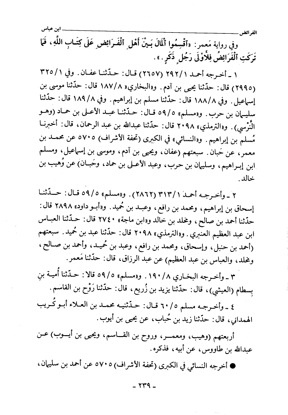 - وفي رواية: اقْسِمُوا الْمَالَ بَيْنَ أَهْلِ الْفَرَائِضِ عَلَى كِتَابِ اللَّهِ فَمَا تَرَكَتِ الْفَرَائِضُ فَلأَوْلَى رَجُلٍ ذَكَرٍ.