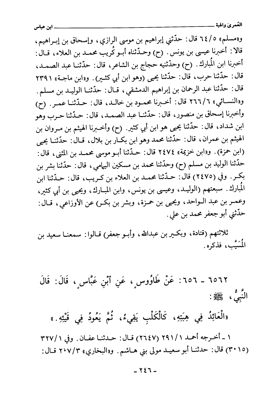 - في رواية عفان: قَالَ طاووس: كُنَّا نَقُولُ وَنَحْنُ صِبْيَانُ الْعَائِدُ فِى هِبَتِهِ كَالْكَلْبِ يَقِئُ ثُمَّ يَعُودُ فِى قَيْئِهِ وَلَمْ نَعْلَمْ أَنَّ رَسُولَ اللَّهِ صلى الله عليه وسلم ضَرَبَ فِى ذَلِكَ مَثَلاً حَتَّى حَدَّثَنَا ابْنُ عَبَّاسٍ أَنَّ رَسُولَ اللَّهِ صلى الله عليه وسلم قَالَ الْعَائِدُ فِى هِبَتِهِ كَالْكَلْبِ يَقِئُ ثُمَّ يَعُودُ فِى قَيْئِهِ.