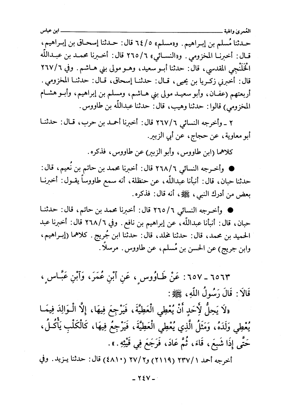 - أخرجه النسائي ٦/ ٢٦٨ وفي "الكبرى" ٦٥٠٠ قال: أخبرنا محمد بن حاتم بن نعيم. قال: حدثنا حبان. قال أنبأنا عبد الله , عن حنظلة بن أبي سفيان، عن طاووس، عن بعض أصحاب النبي صلى الله عليه وسلم قال: مثل الذي يعود فِي هِبَتِهِ، كَمثل الْكَلْبِ يَعُودُ فِي قَيْئِهِ.