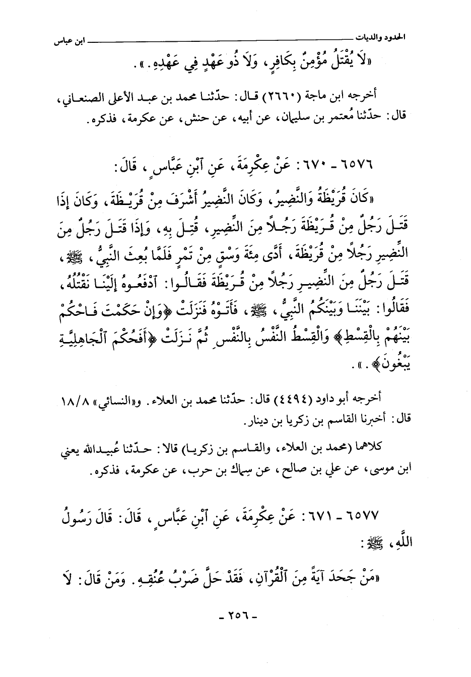 أخرجه أحمد ١/ ٣٦٣ (٣٤٣٤) قال: حدثنا محمد بن سلمة، عن ابن إسحاق، عن داود بن حصين. و"أبو داود" ٣٥١٩ قال: حدثنا عبد الله بن محمد النفيلي، حدثنا محمد بن سلمة، عن محمد بن إسحاق، عن داود بن الحصين. وفي (٤٤٩٤) قال: حدثنا محمد بن العلاء، حدثنا عبيد الله، يعني ابن موسى، عن علي بن صالح، عن سماك بن حرب. و"النَّسَائي" ٨/ ١٨، وفي "الكبرى" ٦٩٠٨ قال أخبرنا القاسم بن زكريا بن دينار. قال: حدثنا غبيد الله بن موسى. قال أنبأنا علي، وهو ابن صالح، عن سماك. وفي ٨/ ١٩، وفي "الكبرى" ٦٩٠٩ قال أخبرنا عبيد الله بن سعد. قال حدثنا عمي. قال: حدثنا أبي، عن ابن إسحاق، أخبني داود ابن الحصين.