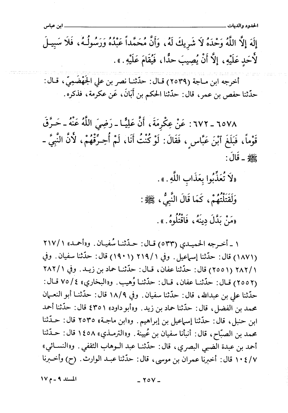 - وفي رواية: أَنَّ عَلِيًّا أُتِىَ بِقَوْمٍ مِنْ هَؤُلَاءِ الزَّنَادِقَةِ وَمَعَهُمْ كُتُبٌ فَأَمَرَ بِنَارٍ فَأُجِّجَتْ ثُمَّ أَحْرَقَهُمْ وَكُتُبَهُمْ قَالَ عِكْرِمَةُ فَبَلَغَ ذَلِكَ ابْنَ عَبَّاسٍ فَقَالَ لَوْ كُنْتُ أَنَا لَمْ أُحَرِّقْهُمْ لِنَهْىِ رَسُولِ اللَّهِ صلى الله عليه وسلم وَلَقَتَلْتُهُمْ لِقَوْلِ رَسُولِ اللَّهِ صلى الله عليه وسلم مَنْ بَدَّلَ دِينَهُ فَاقْتُلُوهُ وَقَالَ رَسُولُ اللَّهِ صلى الله عليه وسلم لَا تُعَذِّبُوا بِعَذَابِ اللَّهِ عَزَّ وَجَلَّ.