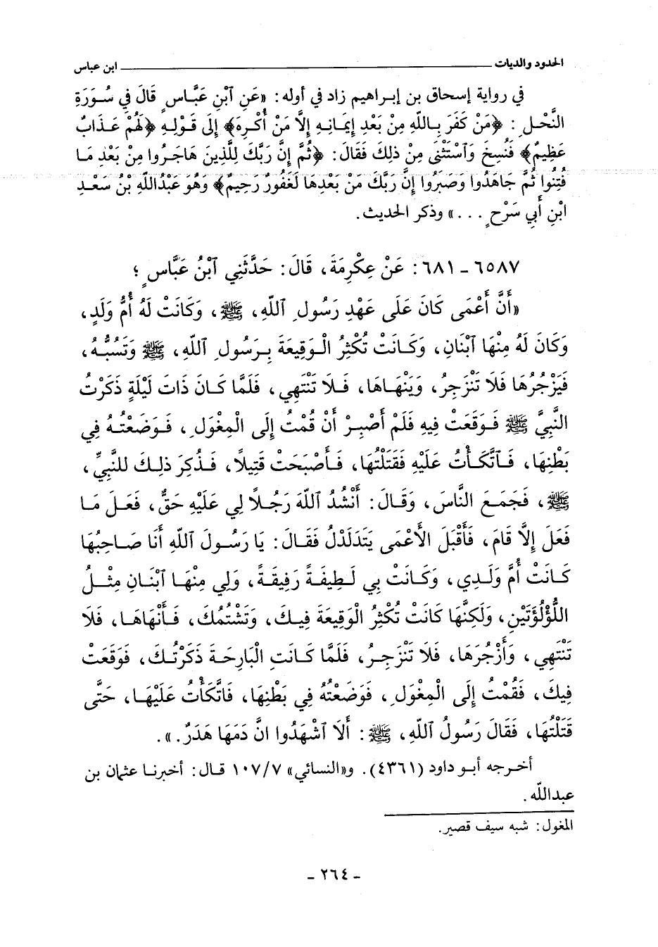 أَنَّ أَعْمَى كَانَ عَلَى عَهْدِ رَسُولِ اللَّهِ صلى الله عليه وسلم وَكَانَتْ لَهُ أُمُّ وَلَدٍ وَكَانَ لَهُ مِنْهَا ابْنَانِ وَكَانَتْ تُكْثِرُ الْوَقِيعَةَ بِرَسُولِ اللَّهِ صلى الله عليه وسلم وَتَسُبُّهُ فَيَزْجُرُهَا فَلَا تَنْزَجِرُ وَيَنْهَاهَا فَلَا تَنْتَهِى فَلَمَّا كَانَ ذَاتَ لَيْلَةٍ ذَكَرْتُ النَّبِىَّ صلى الله عليه وسلم فَوَقَعَتْ فِيهِ فَلَمْ أَصْبِرْ أَنْ قُمْتُ إِلَى الْمِغْوَلِ فَوَضَعْتُهُ فِى بَطْنِهَا فَاتَّكَأْتُ عَلَيْهِ فَقَتَلْتُهَا فَأَصْبَحَتْ قَتِيلاً فَذُكِرَ ذَلِكَ لِلنَّبِىِّ صلى الله عليه وسلم فَجَمَعَ النَّاسَ وَقَالَ أَنْشُدُ اللَّهَ رَجُلاً لِى عَلَيْهِ حَقٌّ فَعَلَ مَا فَعَلَ إِلَاّ قَامَ فَأَقْبَلَ الأَعْمَى يَتَدَلْدَلُ فَقَالَ يَا رَسُولَ اللَّهِ أَنَا صَاحِبُهَا كَانَتْ أُمَّ وَلَدِى وَكَانَتْ بِى لَطِيفَةً رَفِيقَةً وَلِى مِنْهَا ابْنَانِ مِثْلُ اللُّؤْلُؤَتَيْنِ وَلَكِنَّهَا كَانَتْ تُكْثِرُ الْوَقِيعَةَ فِيكَ وَتَشْتُمُكَ فَأَنْهَاهَا فَلَا تَنْتَهِى وَأَزْجُرُهَا فَلَا تَنْزَجِرُ فَلَمَّا كَانَتِ الْبَارِحَةَ ذَكَرْتُكَ فَوَقَعَتْ فِيكَ فَقُمْتُ إِلَى الْمِغْوَلِ فَوَضَعْتُهُ فِى بَطْنِهَا فَاتَّكَأْتُ عَلَيْهَا حَتَّى قَتَلْتُهَا. فَقَالَ رَسُولُ اللَّهِ صلى الله عليه وسلم أَلَا اشْهَدُوا أَنَّ دَمَهَا هَدَرٌ.