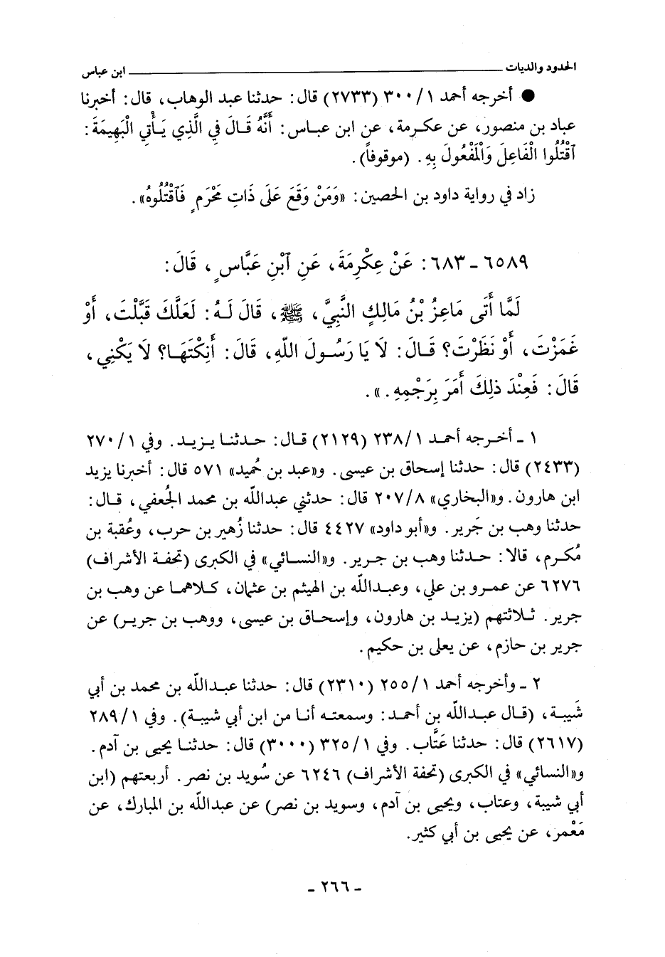 - أخرجه أحمد ١/ ٣٠٠ (٢٧٣٣) قال: حدثنا عبد الوهاب، قال: أخبرنا عباد بن منصور، عن عكرمة، عنِ ابن عباس: أنَّهُ قَالَ في الَّذِي يَأْتي الْبَهِيمَةَ: اقْتُلُوا الْفَاعِلَ وَاْلمَفْعُولَ بِهِ (موقوفَ.