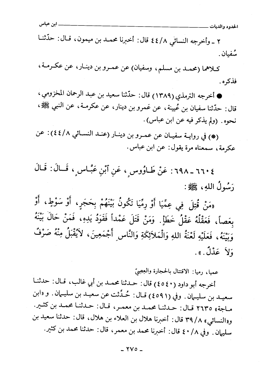 مَنْ قُتِلَ فِى عِمِّيَا أَوْ رِمِّيَا تَكُونُ بَيْنَهُمْ بِحَجَرٍ أَوْ سَوْطٍ أَوْ بِعَصًا فَعَقْلُهُ عَقْلُ خَطَأٍ وَمَنْ قَتَلَ عَمْدًا فَقَوَدُ يَدِهِ فَمَنْ حَالَ بَيْنَهُ وَبَيْنَهُ فَعَلَيْهِ لَعْنَةُ اللَّهِ وَالْمَلَائِكَةِ وَالنَّاسِ أَجْمَعِينَ لَا يُقْبَلُ مِنْهُ صَرْفٌ وَلَا عَدْلٌ.