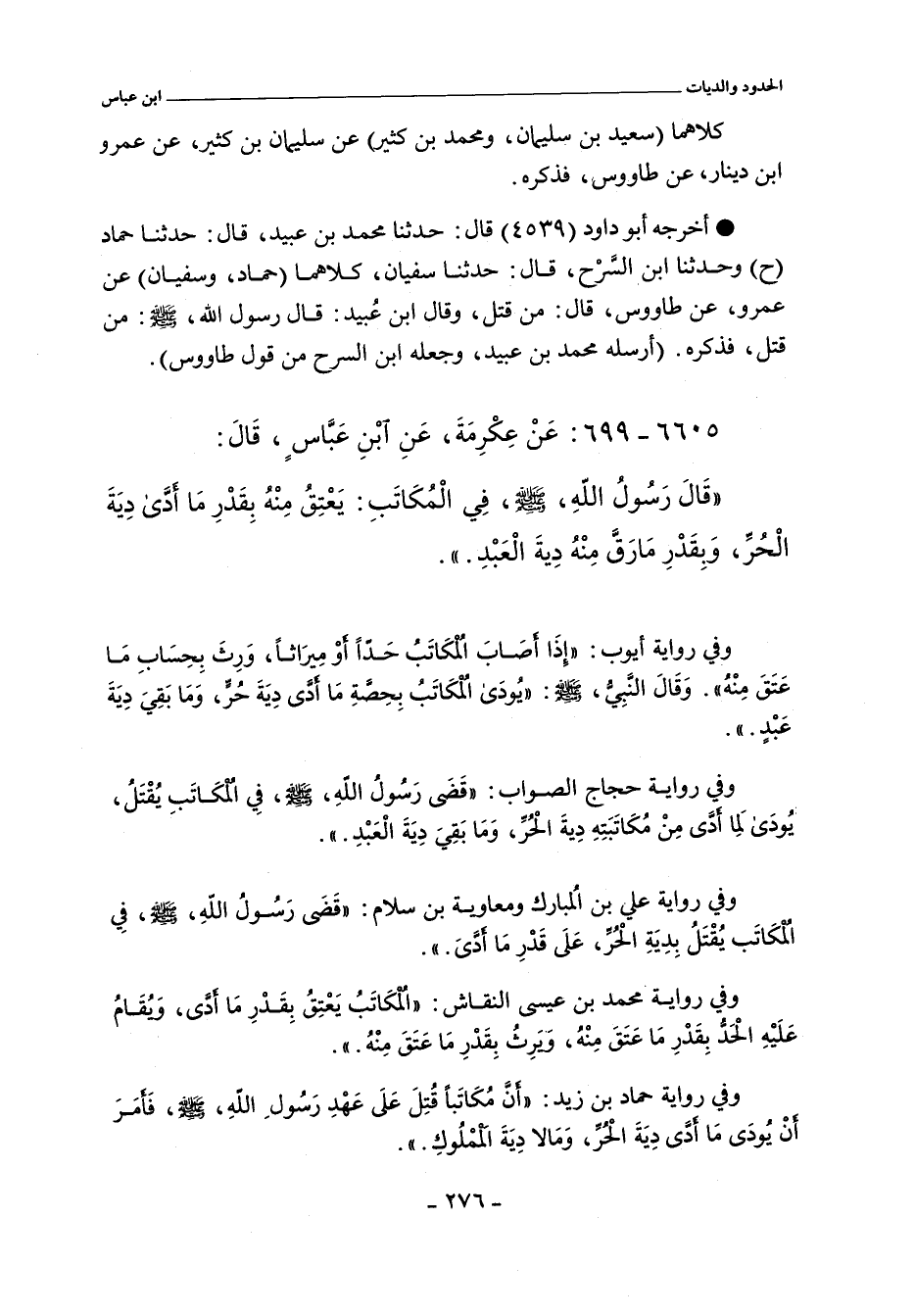 - وفي رواية: قَضَى رَسُولُ اللَّهِ صلى الله عليه وسلم فِى الْمُكَاتَبِ يُقْتَلُ بِدِيَةِ الْحُرِّ عَلَى قَدْرِ مَا أَدَّى.