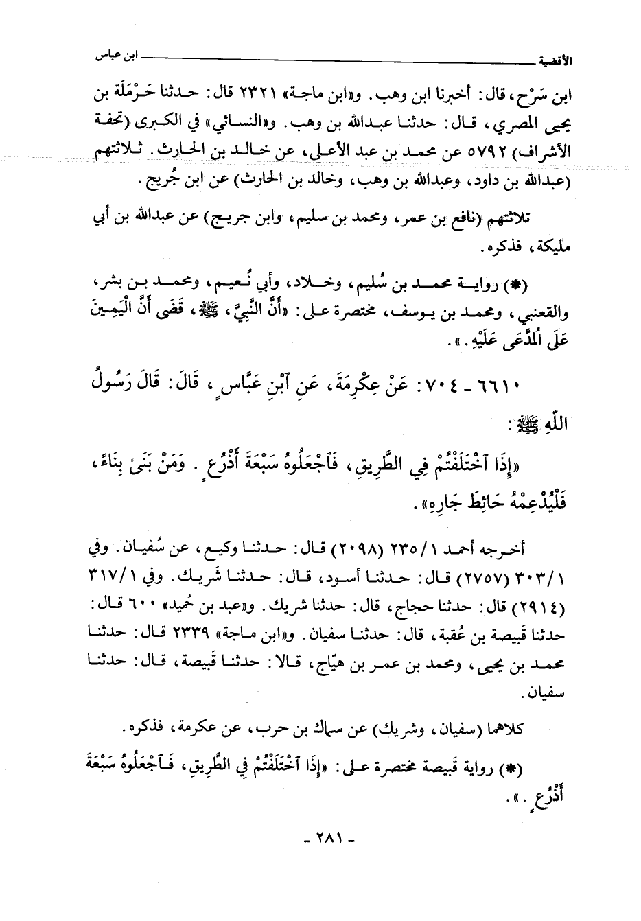ابن سَرْح، أخبرنا ابن وهب، عن ابن جريج. وفي (٤٤٩١) قال: وحدثنا أبو بكر بن أبي شيبة، حدثنا محمد بن بشر عن نافع بن عمر و (أبوداود) ٣٦١٩ قال: حدثنا عبد الله بن مسلمة القعنبي، حدثنا نافع بن عمر. و"ابن ماجة" ٢٣٢١ قال: حدثنا حرملة بن يحيى المصري، حدثنا عبد الله بن وهب، أنبأنا ابن جريج. والتِّرْمِذِيّ" ١٣٤٢ قال: حدثنا محمد بن سهل بن عسكر البغدادي، حدثنا محمد بن يوسف، حدثنا نافع بن عمر الجمحي. و"النَّسَائي" ٨/ ٢٤٨ قال أخبرنا علي بن سعيد بن مسروق، قال: حدثنا يحيى بن أبي زائدة عن نافع بن عمر وفي "الكبرى" ٥٩٥٢ قال: أخبرنا محمد بن عبد الأعلى قال: حدثنا خالد قال: حدثنا ابن جريج.