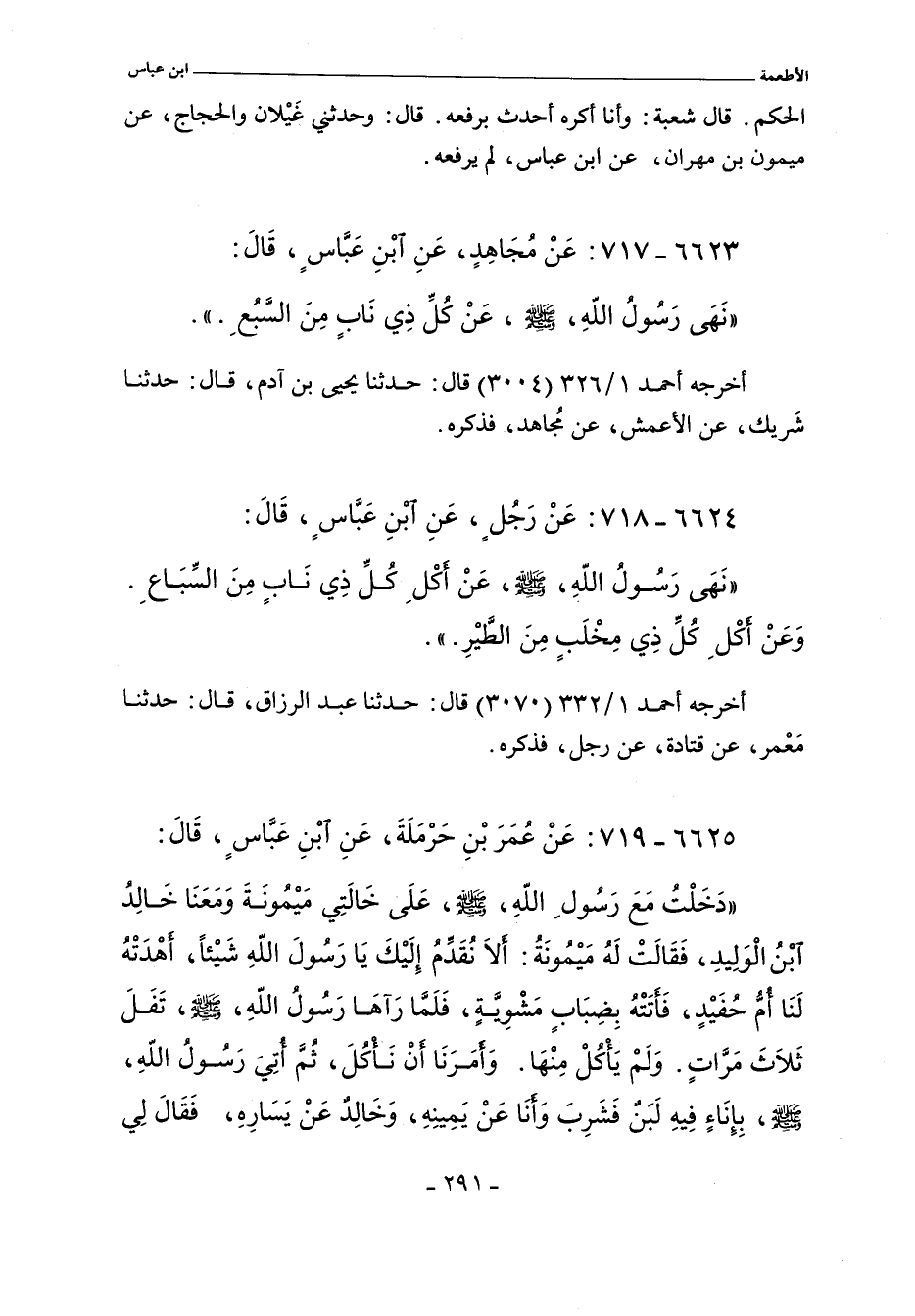 دَخَلْتُ مَعَ رَسُولِ اللَّهِ , صلى الله عليه وسلم , عَلَى خَالَتِى مَيْمُونَةَ وَمَعَنَا خَالِدُ بْنُ الْوَلِيدِ فَقَالَتْ لَهُ مَيْمُونَةُ أَلَا نُقَدِّمُ لَكَ يَا رَسُولَ اللَّهِ شَيْئًا أَهْدَتْهُ لَنَا أُمُّ حَفِيدٍ. فَأَتَتْهُ بِضِبَابٍ مَشْوِيَّةٍ فَلَمَّا رَآهَا رَسُولُ اللَّهِ صلى الله عليه وسلم تَفِلَ ثَلَاثَ مَرَّاتٍ وَلَمْ يَأْكُلْ مِنْهَا وَأَمَرَنَا أَنْ نَأْكُلَ ثُمَّ أُتِىَ رَسُولُ اللَّهِ صلى الله عليه وسلم بِإِنَاءٍ فِيهِ لَبَنٌ فَشَرِبَ وَأَنَا عَنْ يَمِينِهِ وَخَالِدٌ عَنْ يَسَارِهِ فَقَالَ لِى