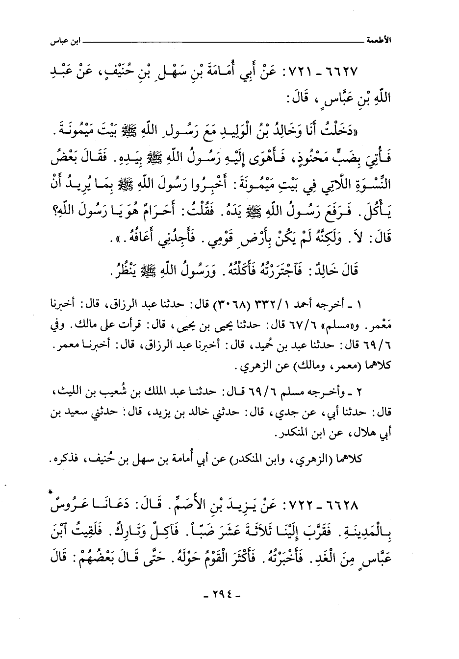 أَنَّ خَالِدَ بْنَ الوَلِيدِ دَخَلَ بَيْتَ مَيْمُونَةَ، زَوْجِ النَّبِيِّ صلى الله عليه وسلم، فَأُتِيَ بِضَبٍّ عَنْوَةٍ، فَأَهْوَى إِلَيْهِ رَسُولُ اللهِ صلى الله عليه وسلم، فَقَالَ بَعْضُ النِّسْوَةِ اللَاّئِي فِي بَيْتِ مَيْمُونَةَ: أَخْبِرُوا رَسُولَ اللهِ صلى الله عليه وسلم بِمَا يُرِيدُ أَنْ يَأْكُلَ مِنْهُ. فَقَالُوا: هُوَ ضَبٌّ، فَرَفَعَ يَدَهُ، فَقُلْتُ: أَحَرَامٌ هُوَ يَا رَسُولَ اللهِ؟ قَالَ: لَا، وَلَمْ يَكُنْ بِأَرْضِ قَوْمِي، فَأَجِدُنِي أَعَافُهُ، فَاجْتَرَرْتُهُ، فَأَكَلْتُهُ، وَرَسُولُ اللهِ صلى الله عليه وسلم يَنْظُرُ.