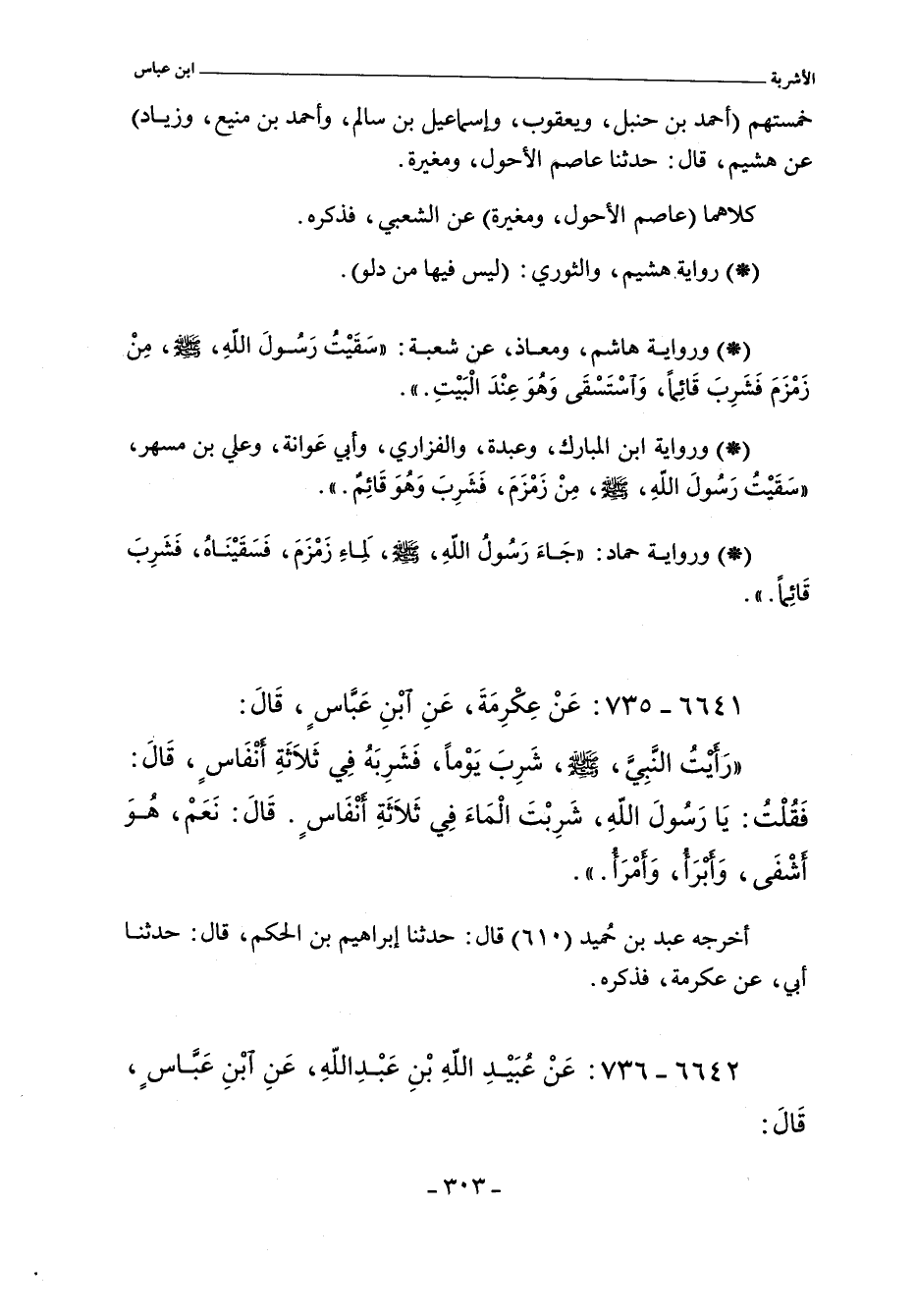 رأيتُ النبي، صلى الله عليه وسلم، شَرِبَ يَوْمًا، فَشَرِبَهُ فِي ثَلَاثَةِ أنْفَاسٍ، فَقُلْتُ: يَا رَسُولَ الله، شَرِبْتَ الْمَاءَ فِي ثَلَاثَةِ أنْفَاسٍ. قَالَ: نَعَمْ، هُوَ أشْفَى، وَأبرأ، وَأمرأ.