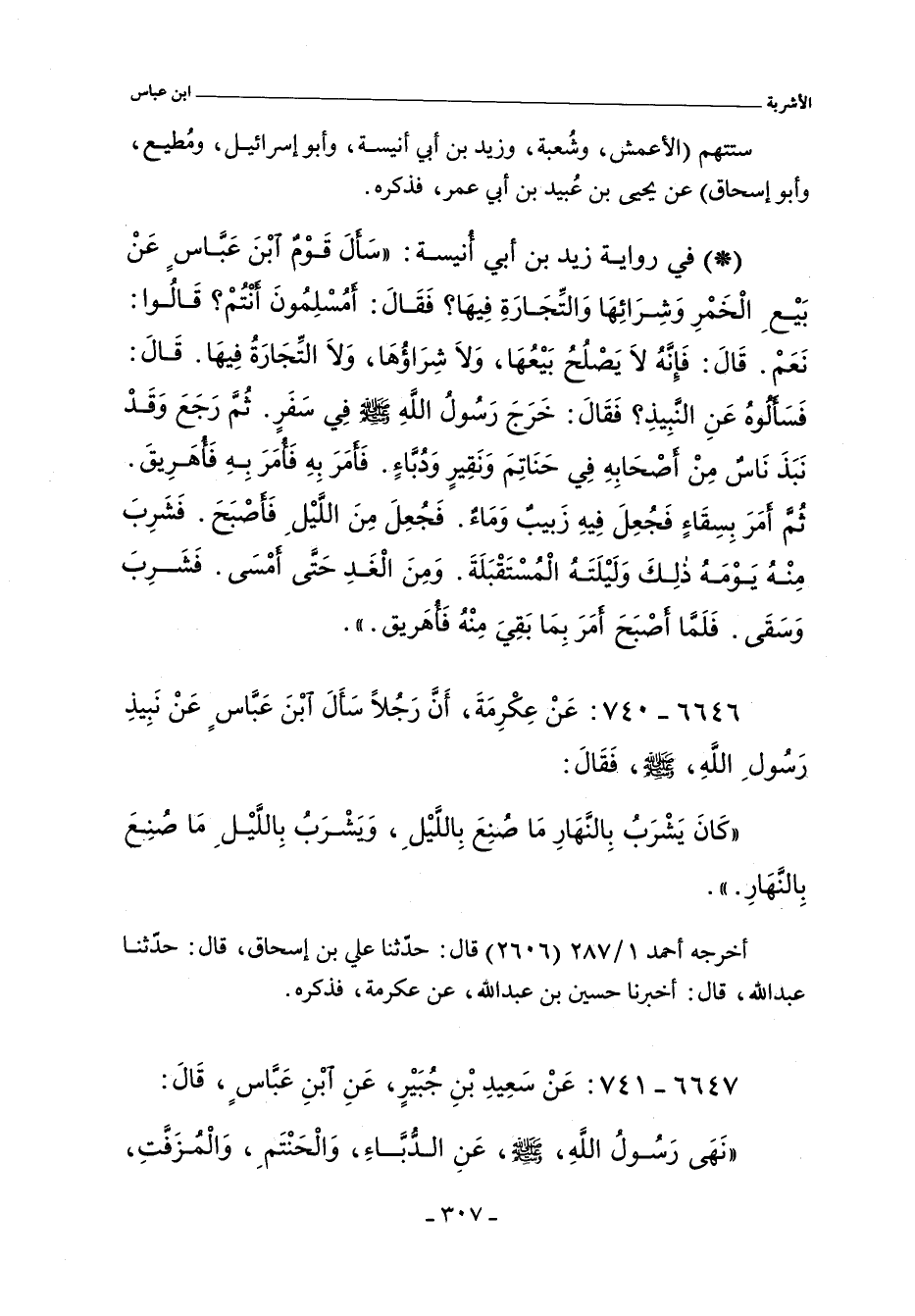 ٦٦٤٦ - عَنْ عِكْرِمَةَ أَنَّ رَجُلاً سَأَلَ ابْنَ عَبَّاسٍ عَنْ نَبِيذِ رَسُولِ اللَّهِ صلى الله عليه وسلم فَقَالَ: