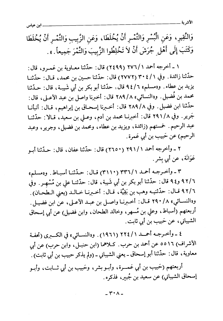 أخرجه أحمد ١/ ٢٧٦ (٢٤٩٩) قال: حدثنا معاوية، هو ابن عَمرو، حدثنا زائدة حدثنا حبيب بن أبي عمرة. وفي ١/ ٢٩١ (٢٦٥٠) قال: حدثنا عفان، حدثنا أبو عَوَانَة، عن أبي بشر. وفي ١/ ٣٠٤ (٢٧٧٢) قال: حدثنا حسين بن محمد، حدثنا يزيد بن عطاء، عن حبيب، يعني ابن أبي عمرة. وفي ١/ ٣٣٦ (٣١١٠) قال: حدثنا أسباط، حدثنا الشيباني، عن حبيب بن أبي ثابتى و"مسلم" ٦/ ٩٢ (٥٢٠٧) و ٦/ ٩٤ (٥٢٢٤) قال: حدثنا أبوبكر بن أبي شَيبة، حدثنا علي بن مُسْهِر، عن الشيباني، عن حبيب. وفي ٦/ ٩٢ (٥٢٠٨) قال: وحدثنيه وهب بن بَقِية، أخبرنا خالد، يعني الطحان، عن الشيباني، عن حبيب. وفي ٦/ ٩٤ (٥٢٢٥) قال: حدثنا أبوبكر بن أبي شَيبة، حدثنا محمد بن فُضيل، عن حبيب بن أبي عمرة. و"النَّسائي" ٨/ ٢٨٩، ٥٠٣٢ قال: أخبرنا واصل بن عبد الأعلى. قال: حدثنا ابن فضيل، عن حبيب بن أبي عمرة. وفي ٨/ ٢٨٩ وفي "الكبرى" ٥٠٣٩ قال: أخبرنا إسحاق بن إبراهيم. قال: أنبأنا جَرير، عن حبيب بن أبي عمرة. وفي ٨/ ٢٩٠، وفي "الكبرى" ٥٠٤٧ قال: أخبرنا واصل بن عبد الأعلى، عن ابن فضيل، عن أبي إسحاق، عن حبيب ابن أبي ثابت. وفي ٨/ ٢٩١ و ٥٠٤٩ و ٦٧٧٤ قال: أخبرنا محمد بن آدم، وعلي بن سعيد. قالا: حدثنا عبد الرحيم عن حبيب بن أبي عمرة. وفي "الكبرى" ٥٨٣١ قال: أخبرنا محمد بن آدم، عن عبد الرحيم، وهو ابن سليمان، عن سليمان الشيباني، عن حبيب بن أبي ثابت.