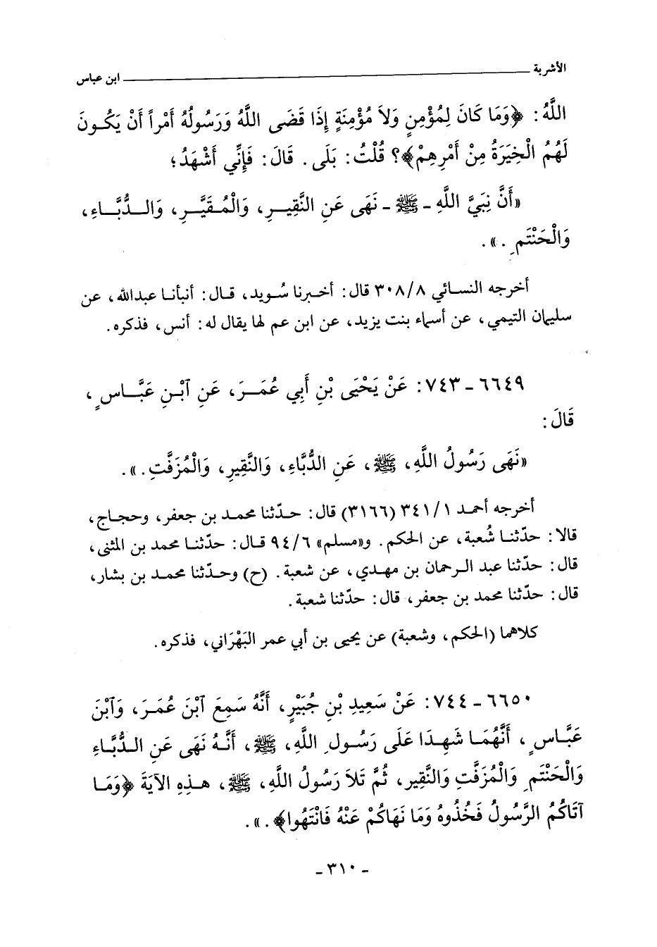 أَنَّهُ نَهَى عَنِ الدُّبَّاءِ وَالْحَنْتَمِ وَالْمُزَفَّتِ وَالنَّقِيرِ ثُمَّ تَلَا رَسُولُ اللَّهِ صلى الله عليه وسلم هَذِهِ الآيَةَ (وَمَا آتَاكُمُ الرَّسُولُ فَخُذُوهُ وَمَا نَهَاكُمْ عَنْهُ فَانْتَهُوا).