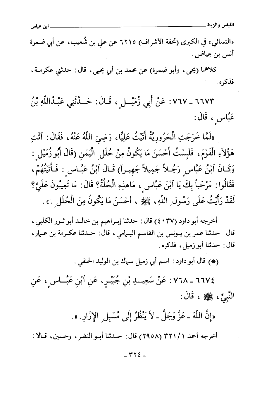 ٦٦٧٣ - عن أَبي زُمَيْلٍ حَدَّثَنِى عَبْدُ اللَّهِ بْنُ عَبَّاسٍ قَالَ لَمَّا خَرَجَتِ الْحَرُورِيَّةُ أَتَيْتُ عَلِيًّا رَضِىَ اللَّهُ عَنْهُ فَقَالَ ائْتِ هَؤُلَاءِ الْقَوْمَ. فَلَبِسْتُ أَحْسَنَ مَا يَكُونُ مِنْ حُلَلِ الْيَمَنِ قَالَ أَبُو زُمَيْلٍ وَكَانَ ابْنُ عَبَّاسٍ رَجُلاً جَمِيلاً جَهِيرًا قَالَ ابْنُ عَبَّاسٍ فَأَتَيْتُهُمْ فَقَالُوا مَرْحَبًا بِكَ يَا ابْنَ عَبَّاسٍ مَا هَذِهِ الْحُلَّةُ قَالَ مَا تَعِيبُونَ عَلَىَّ؟