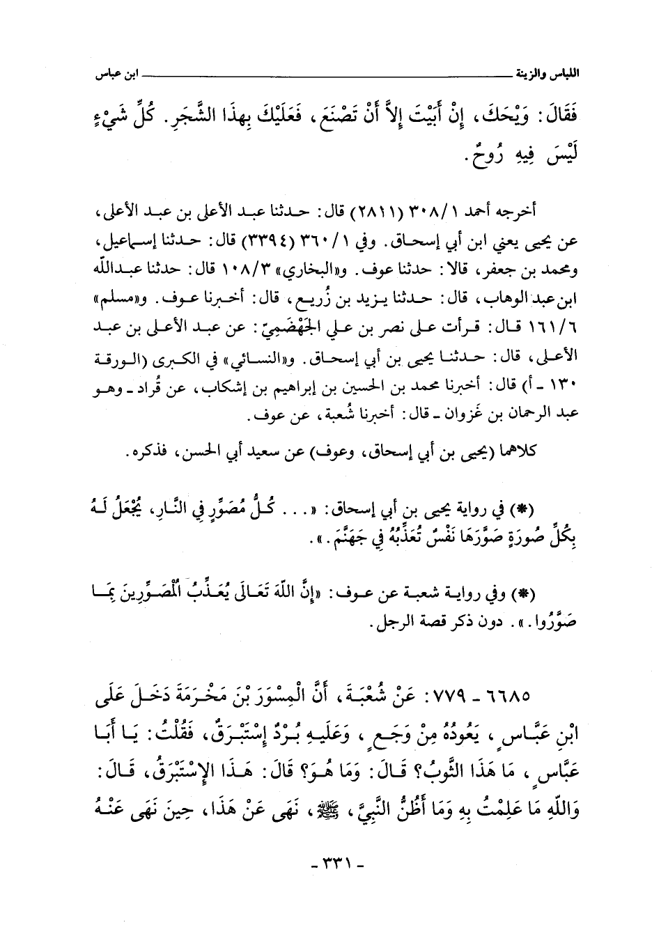 - وفي رواية: جَاءَ رَجُلٌ إِلَى ابْنِ عَبَّاسٍ فَقَالَ يَا ابْنَ عَبَّاسٍ إِنِّى رَجُلٌ أُصَوِّرُ هَذِهِ الصُّوَرَ وَأَصْنَعُ هَذِهِ الصُّوَرَ فَأَفْتِنِى فِيهَا. قَالَ ادْنُ مِنِّى. فَدَنَا مِنْهُ فَقَالَ ادْنُ مِنِّى. فَدَنَا مِنْهُ حَتَّى وَضَعَ يَدَهُ عَلَى رَأْسِهِ قَالَ أُنَبِّئُكَ بِمَا سَمِعْتُ مِنْ رَسُولِ اللَّهِ صلى الله عليه وسلم سَمِعْتُ رَسُولَ اللَّهِ صلى الله عليه وسلم يَقُولُ كُلُّ مُصَوِّرٍ فِى النَّارِ يُجْعَلُ لَهُ بِكُلِّ صُورَةٍ صَوَّرَهَا نَفْسٌ تُعَذِّبُهُ فِى جَهَنَّمَ» فَإِنْ كُنْتَ لَا بُدَّ فَاعِلاً فَاجْعَلِ الشَّجَرَ وَمَا لَا نَفْسَ لَهُ.