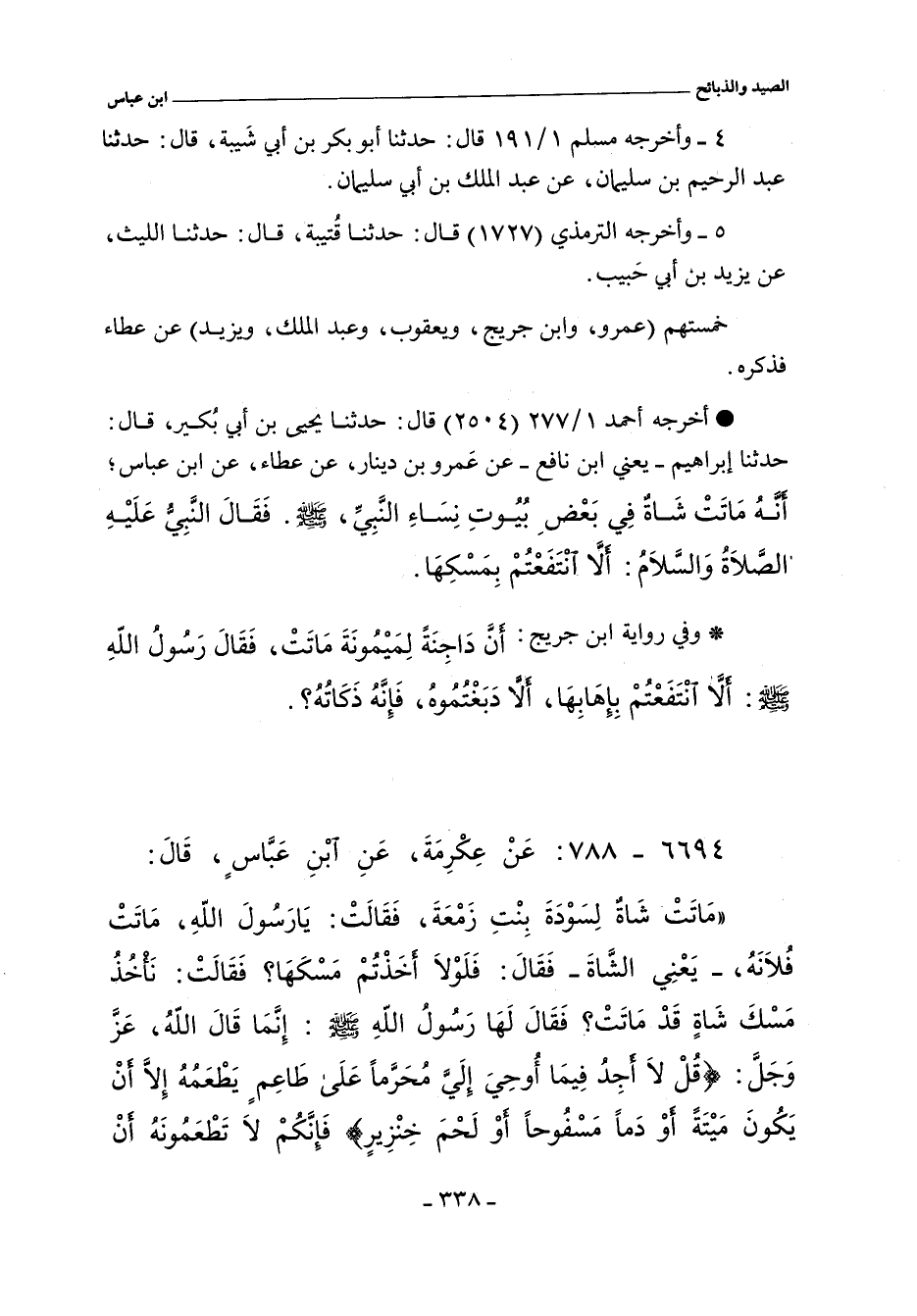 - وفي رواية: ماتت شاة لإحدى نساء النبي صلى الله عليه وسلم , فقال النبي , عليه السلام: ألا انتفعتم بإهابها؟.