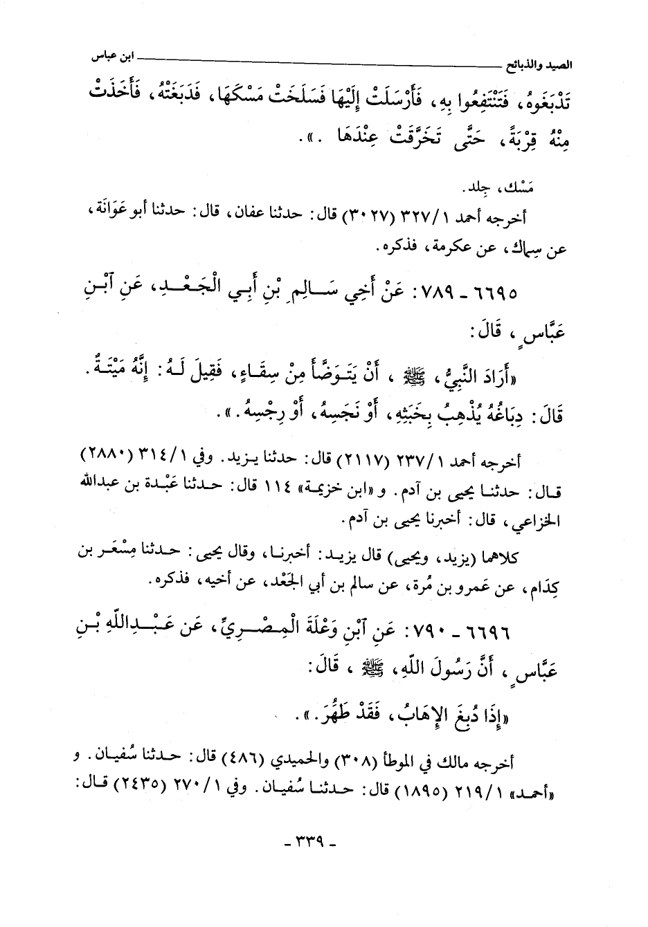 - وفي رواية: سَأَلْتُ عَبْدَ اللَّهِ بْنَ عَبَّاسٍ قُلْتُ إِنَّا نَكُونُ بِالْمَغْرِبِ وَمَعَنَا الْبَرْبَرُ وَالْمَجُوسُ نُؤْتَى بِالْكَبْشِ قَدْ ذَبَحُوهُ وَنَحْنُ لَا نَأْكُلُ ذَبَائِحَهُمْ وَيَأْتُونَا بِالسِّقَاءِ يَجْعَلُونَ فِيهِ الْوَدَكَ. فَقَالَ ابْنُ عَبَّاسٍ قَدْ سَأَلْنَا رَسُولَ اللَّهِ صلى الله عليه وسلم عَنْ ذَلِكَ فَقَالَ دِبَاغُهُ طَهُورُهُ.